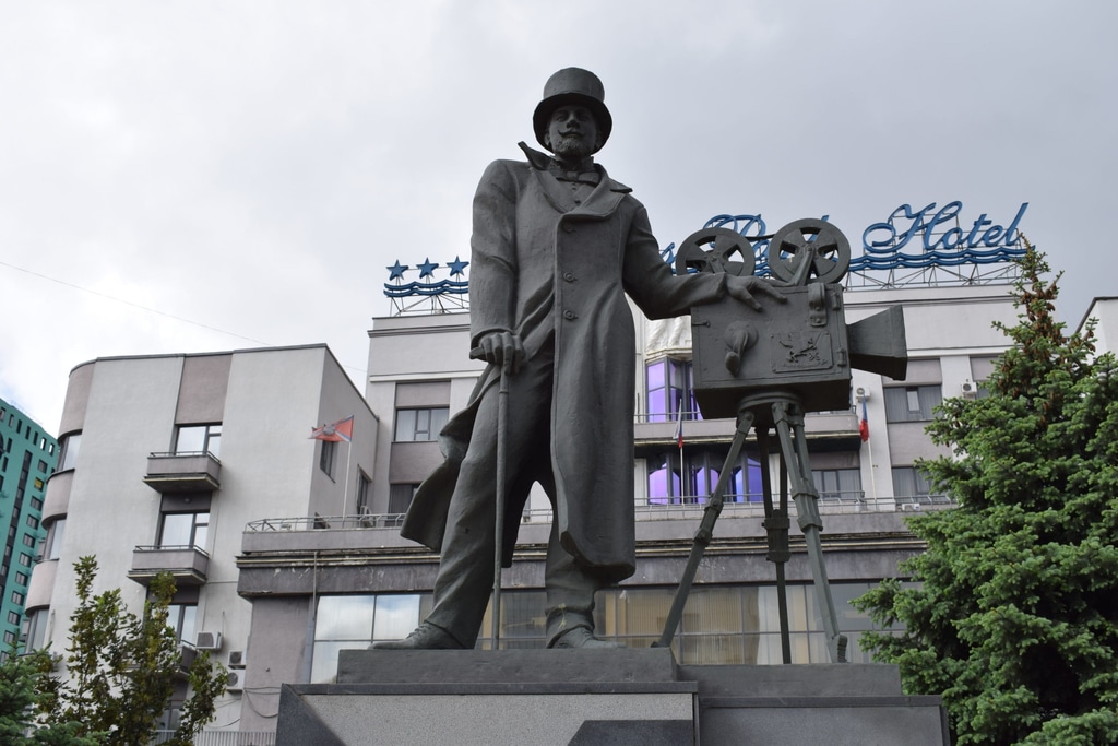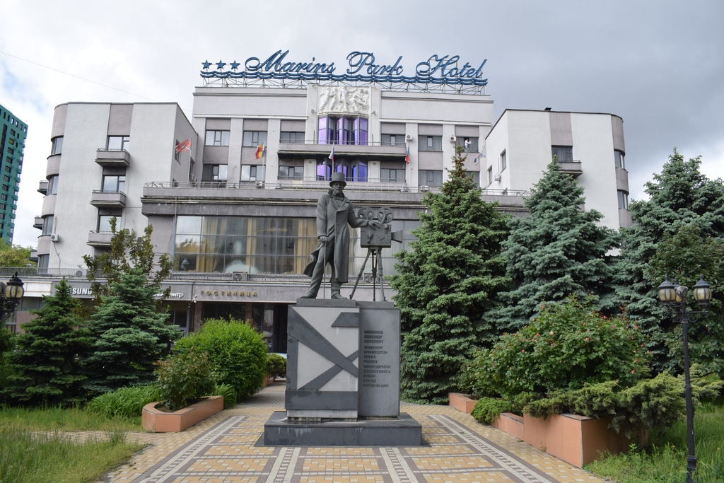 В 2016 году перед гостиницей появился памятник кинематографисту Ханжонкову, который провел в Ростове-на-Дону детские и юношеские годы. Ханжонков стоял у истоков российского кинематографа. Его компания в начале 20 века считалась лидером российского кинопроизводства. Революция резко изменила жизнь кинематографиста. При советской власти он занимал скромные должности в киноиндустрии, а потом и вовсе ушел на пенсию по состоянию здоровья. Последние годы жизни Ханжонков провел в Ялте. Там же находится и его могила.