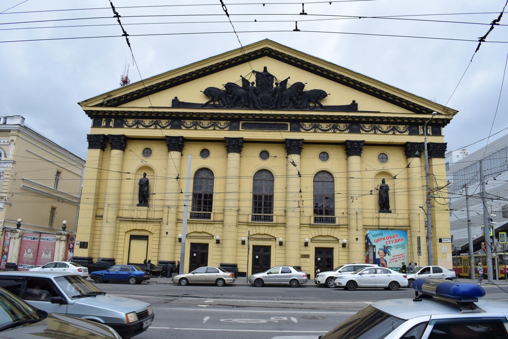Следуя дальше от здания Госбанка по улице Большой Садовой, можно вскоре выйти к Театральной площади. До 20 века на месте площади был пустырь. Он входил территорию города Нахичеван, о котором говорилось ранее. Еще до революции в 1913 году на пустыре было построено здание управления Владикавказской железной дорогой. Оно сохранилось до наших дней и сегодня принадлежит Российской железной дороге.