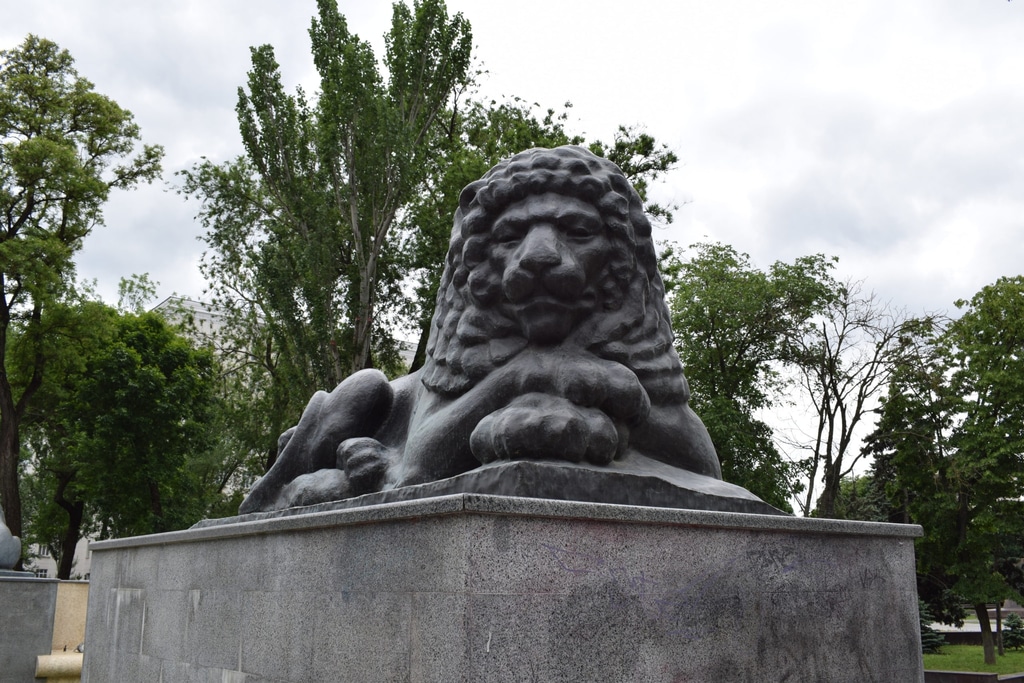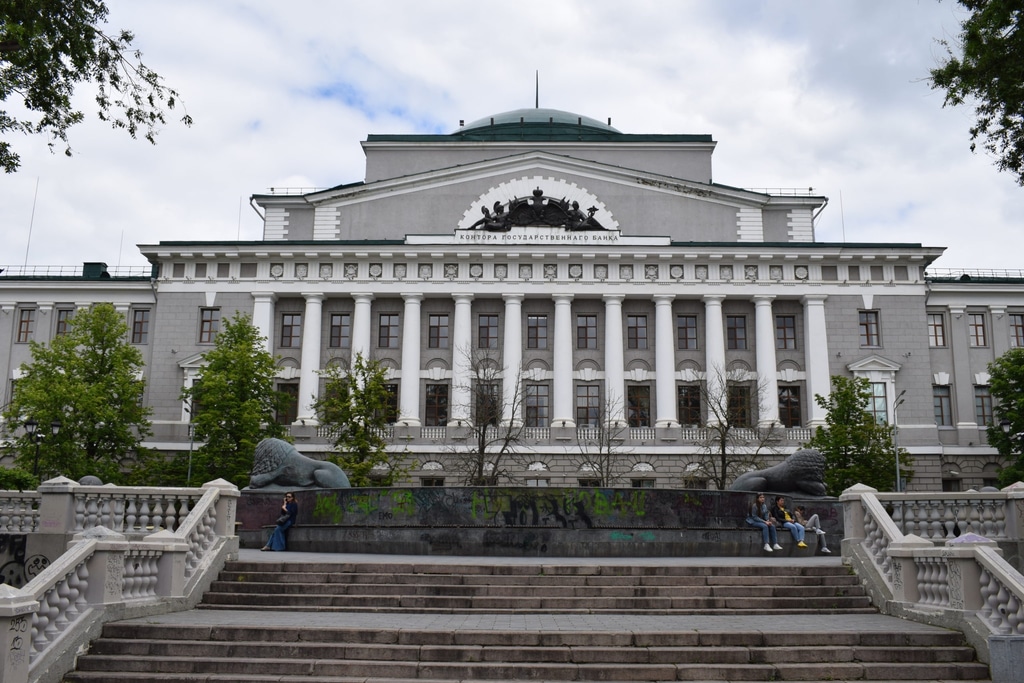 Прямо перед зданием Госбанка расположился фонтан с двумя умиротворенными львами. Львы и фонтан появились на этом месте в 1917 году.