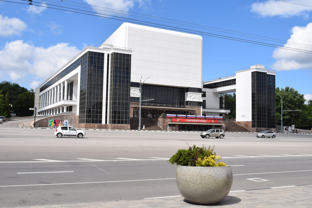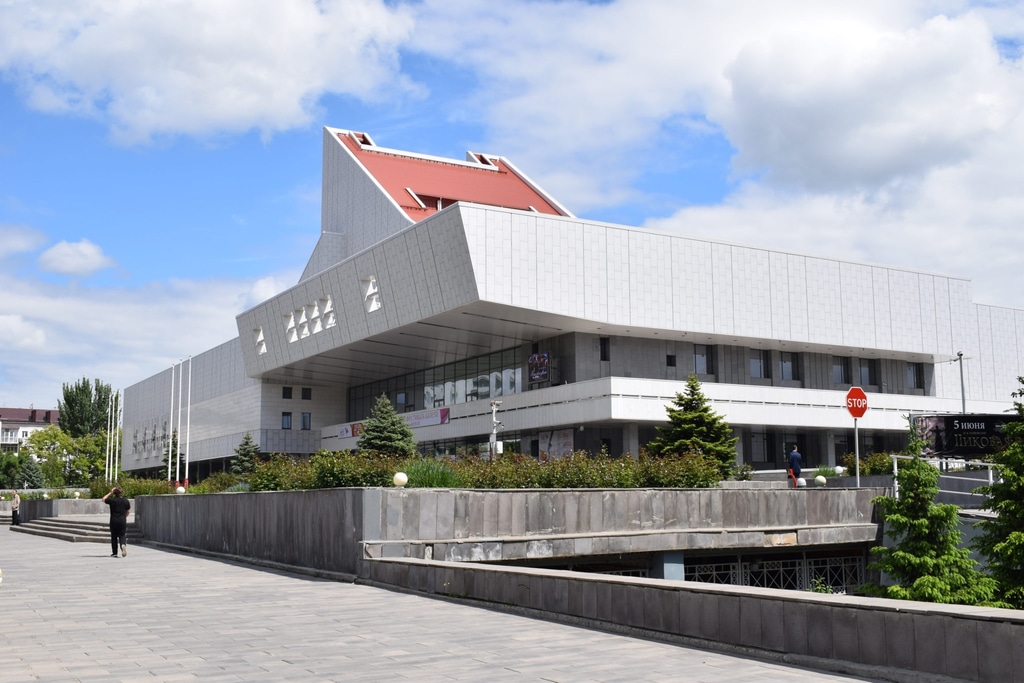 На другой стороне Большой Садовой напротив Покровской церкви возвышается здание музыкального театра. Музыкальный театр в Ростове-на-Дону начал работать еще до революции в конце 19 века. В здание на Большой Садовой он переехал в 1999 году. Строительство этого здания длилось необыкновенно долго целых 22 года. В этот раз строители придали театру вид белого рояля. Это, конечно же, лучше трактора.
