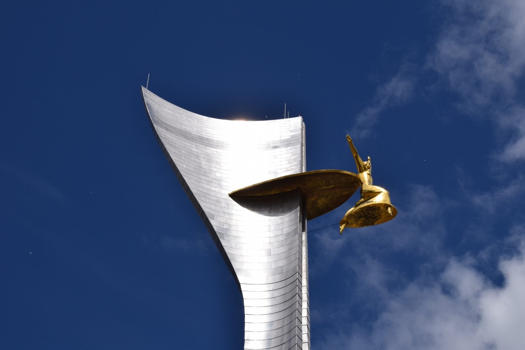 Верх стелы украшает позолоченная скульптура греческой богини победы Ники.