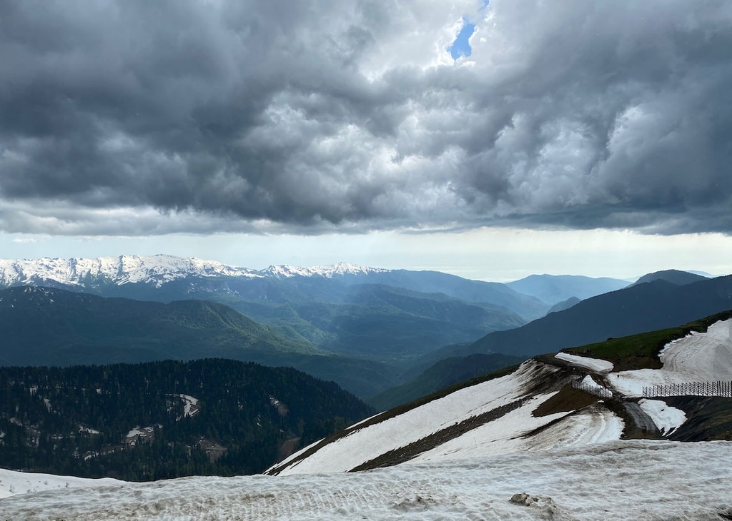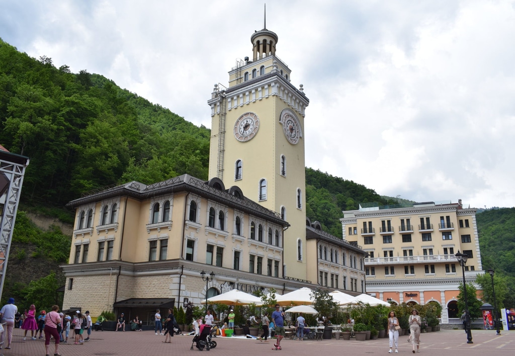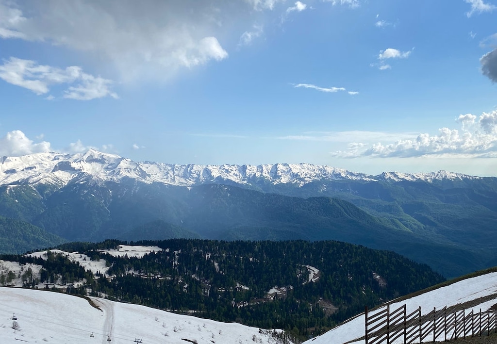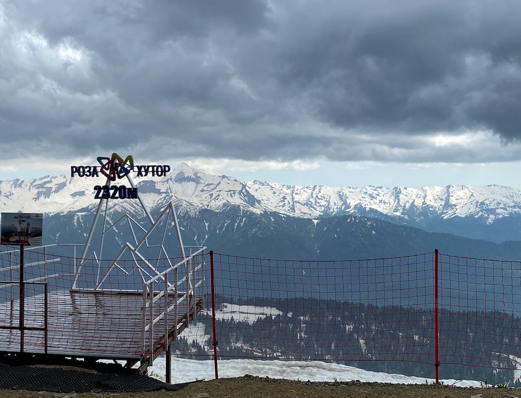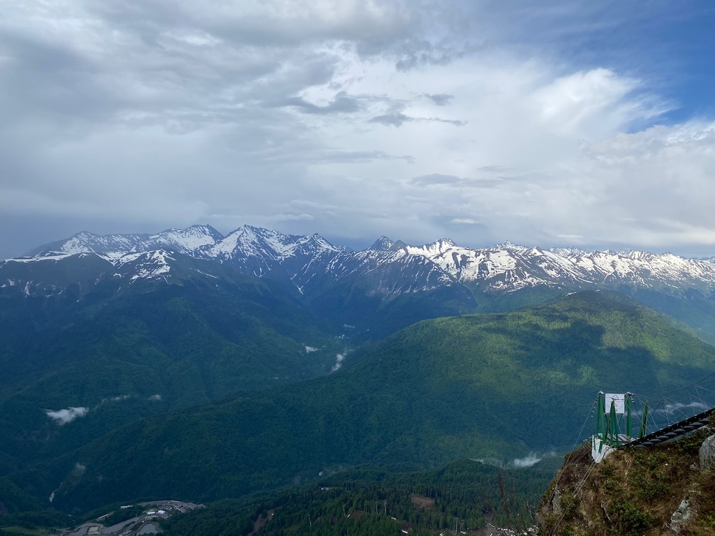 Перебравшись по мосту через реку Мзымту, мы выходим прямо к билетным кассам. С них начинается подъем на канатной дороге на Розу Пик — самую популярную вершину горного хребта Аибга. В переводе с адыгейского языка на русский Аибга означает «злой хребет». На вершинах Аибги круглый год лежит снег.