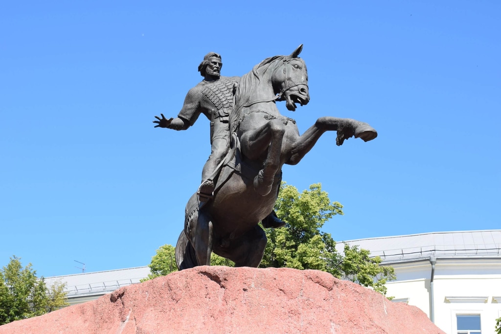 Следуя по Почтовой улице, мы выходим к памятнику Евпатию Коловрату. Надо сказать, Коловрат и для рязанцев, и для всех россиян личность легендарная. Прославился этот богатырь тем, что не побоялся вступить в неравную схватку с татаро-монголами.