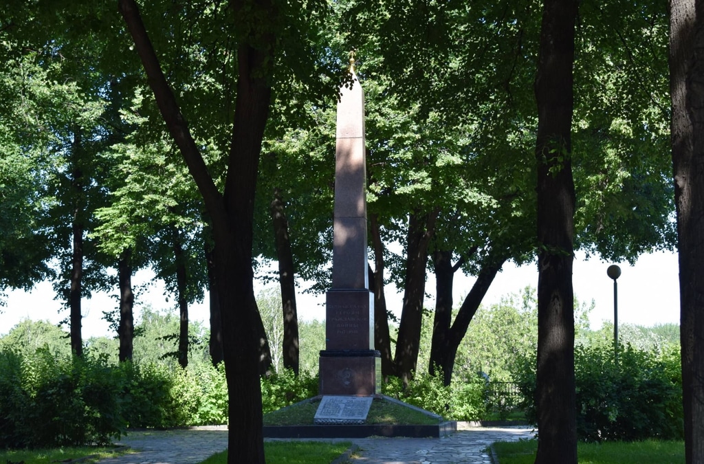 Уже на выходе из Кремлевского парка слева от нас возвышается памятная стела, а справа — Ильинская церковь.