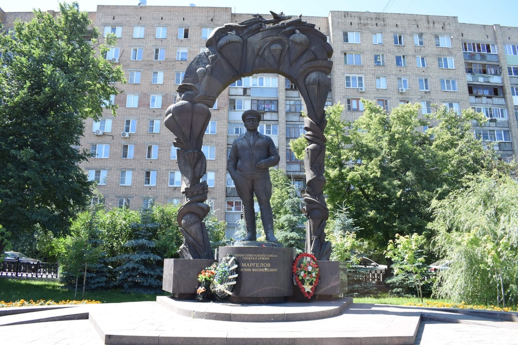 В 2000-х годах в сквере генералу установили памятник. Маргелов хотя и был военным, но здесь в бронзе выглядит вполне себе мирно. Стоит себе генерал под аркой из парашютов и смотрит куда-то вдаль. Будто вышел ненадолго прогуляться…
