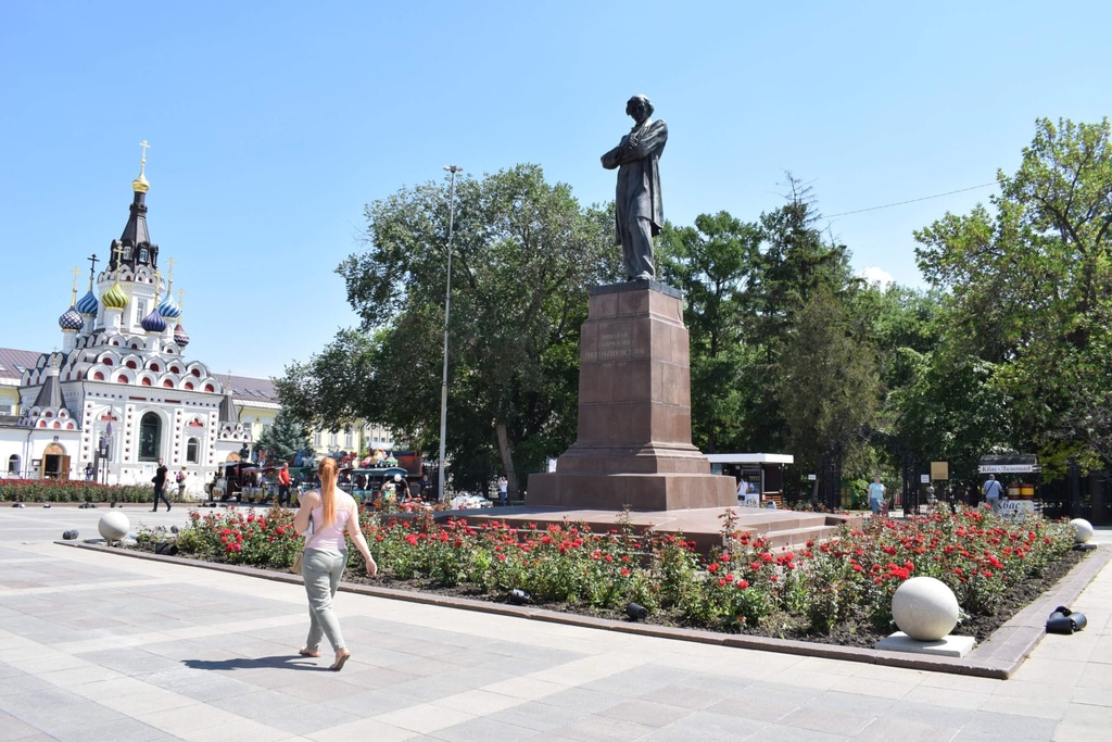 Напротив церкви Утоли моя печали возвышается памятник писателю Чернышевскому. Надо отметить, в Саратове бережно хранят память о своем знаменитом земляке. В доме, где Чернышевский родился и жил, работает музей. О музее мы обязательно поговорим в отдельной статье.
