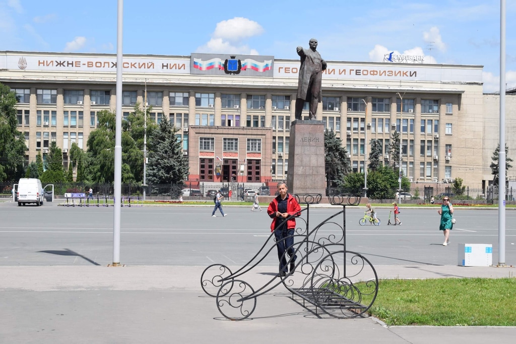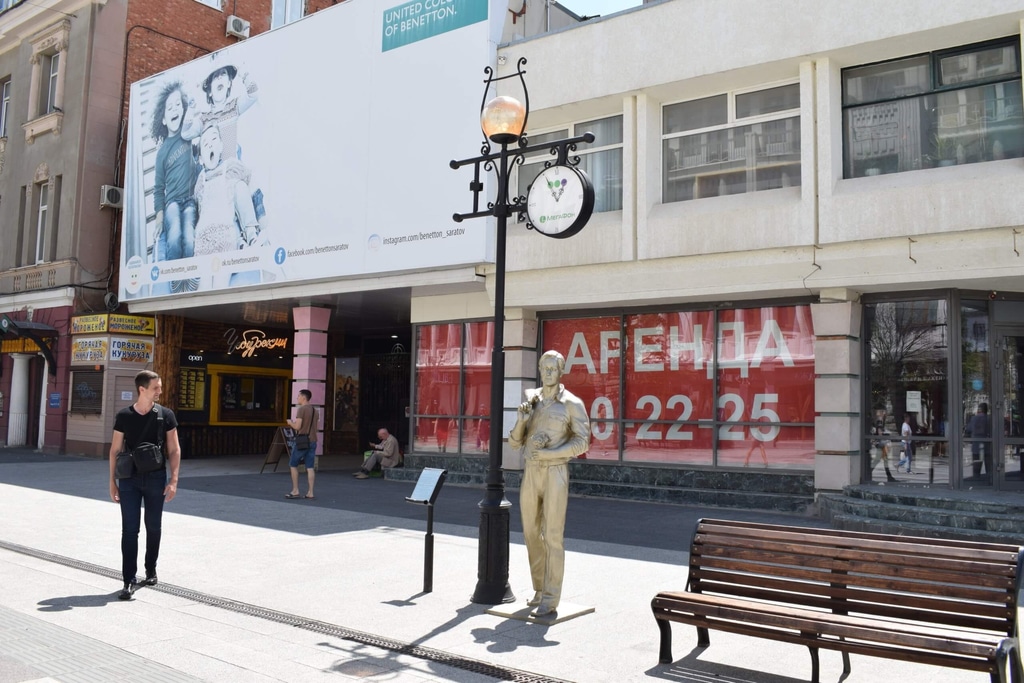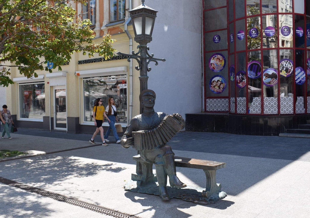 Ну а какой же Саратов без знаменитого саратовского гармониста? Вот он сидит в самом центре на лавочке и веселит народ.
