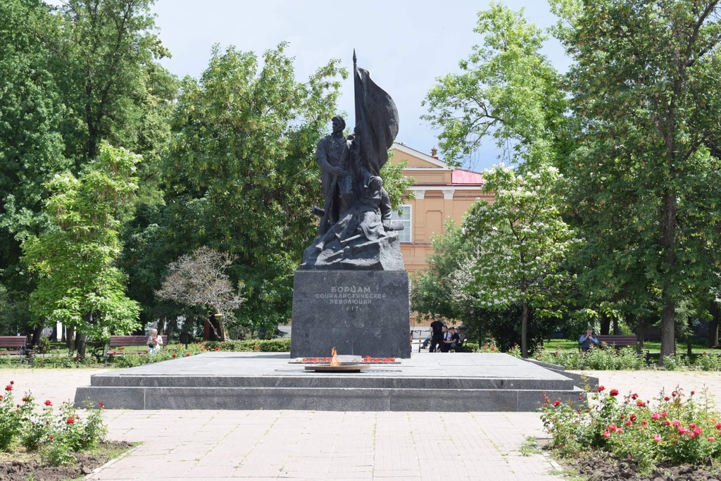 А дальше — памятник борцам социалистической революции 1917 года. Кстати сказать, памятник не простой. Под ним находится настоящая братская могила. В ней похоронены защитники революции, погибшие во время контрреволюционного мятежа.