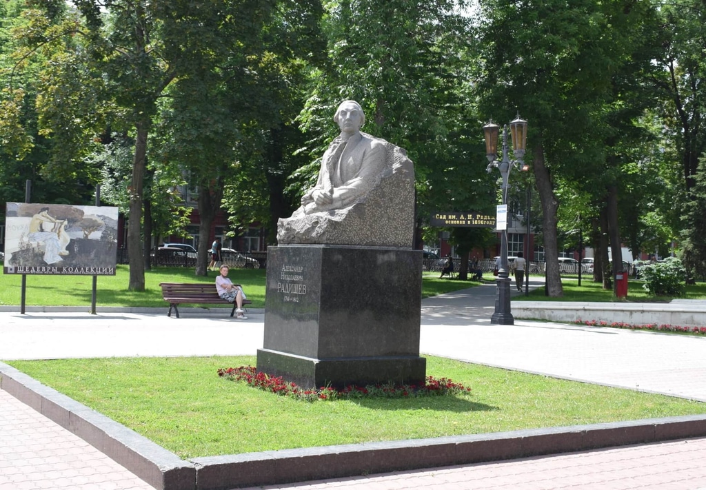 Надо сказать, памятник Радищеву появился в Саратове совсем не случайно. Этот известный писатель и государственный деятель родился в селе недалеко от Саратова. Музей тоже носит имя Радищева. Он открылся в городе еще до революции в 1885 году. Это был первый общедоступный художественный музей в России. В основу его коллекции легли произведения искусства, подаренные внуком Радищева художником Боголюбовым.
