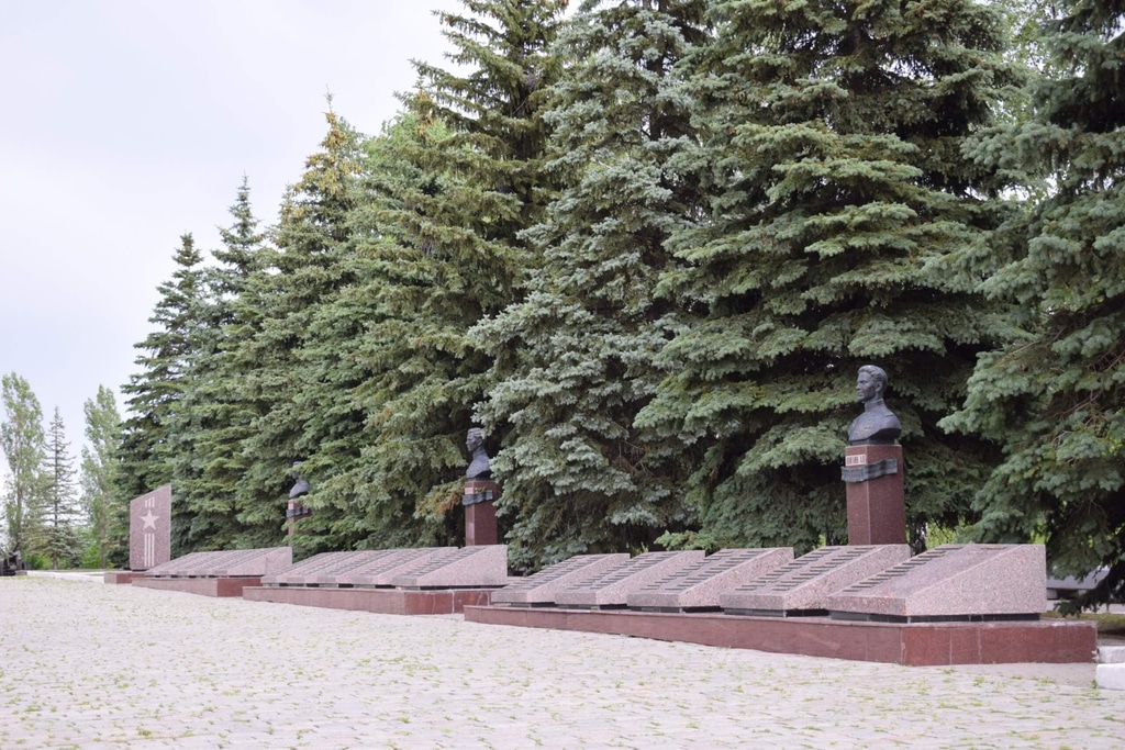 Здесь же недалеко от памятника — Аллея Героев с мемориальными плитами по обе стороны. На них выгравированы имена героев — саратовцев, которые особо отличились на фронте.