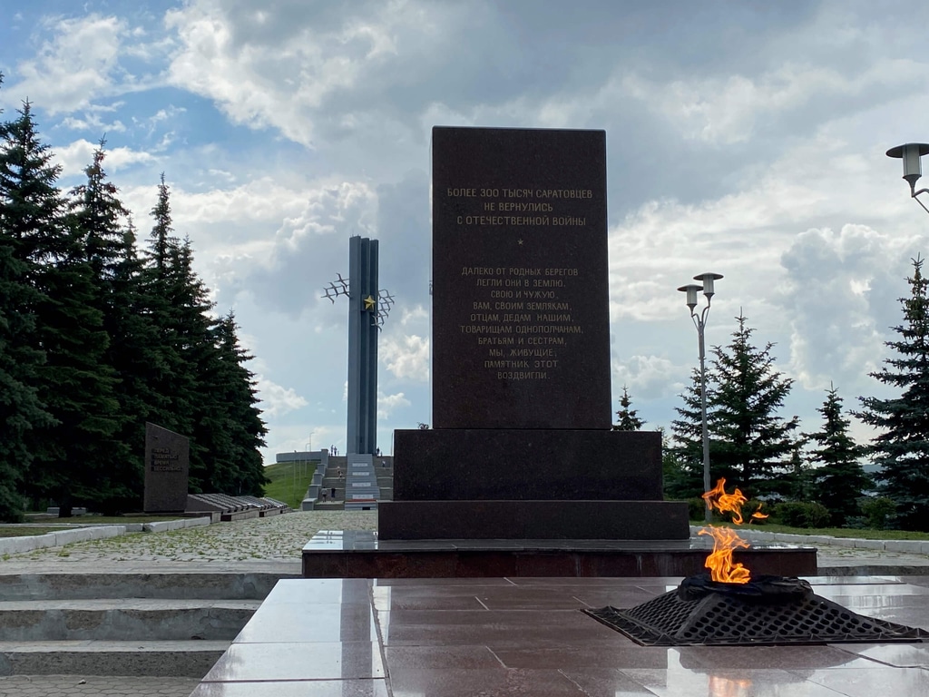 Еще подальше от «Журавлей» — мемориал «Вечный огонь». Кстати сказать, более 300 тысяч саратовцев не вернулись с фронта. Цифра просто ошеломляющая! Это по численности целый город и довольной крупный.