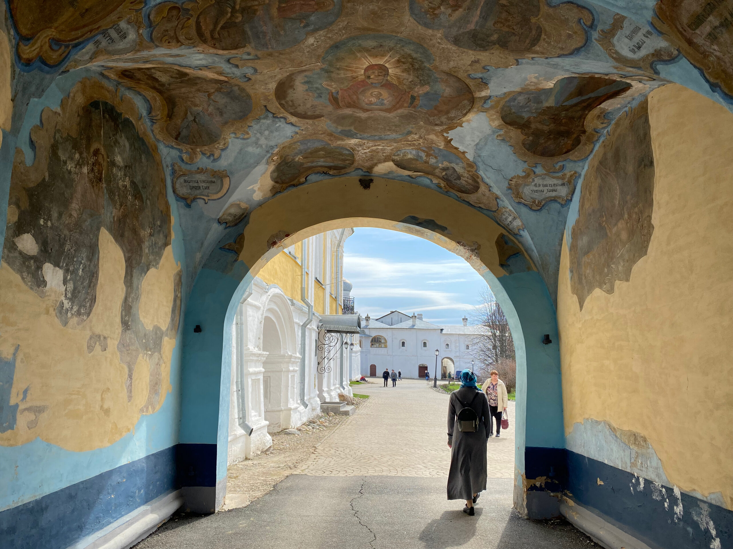 Вход на территорию обители осуществляется со стороны самой древней части стен 16 века через Святые ворота.