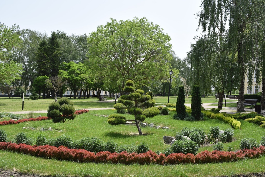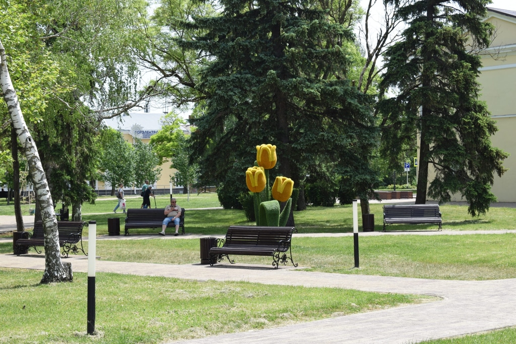 Перед бассейном раскинулся симпатичный зеленый сквер с каменными инсталляциями.