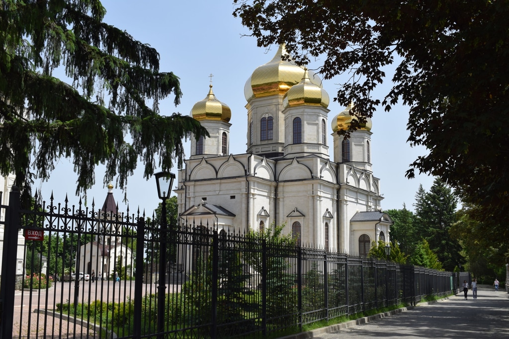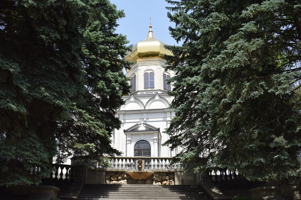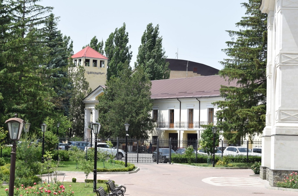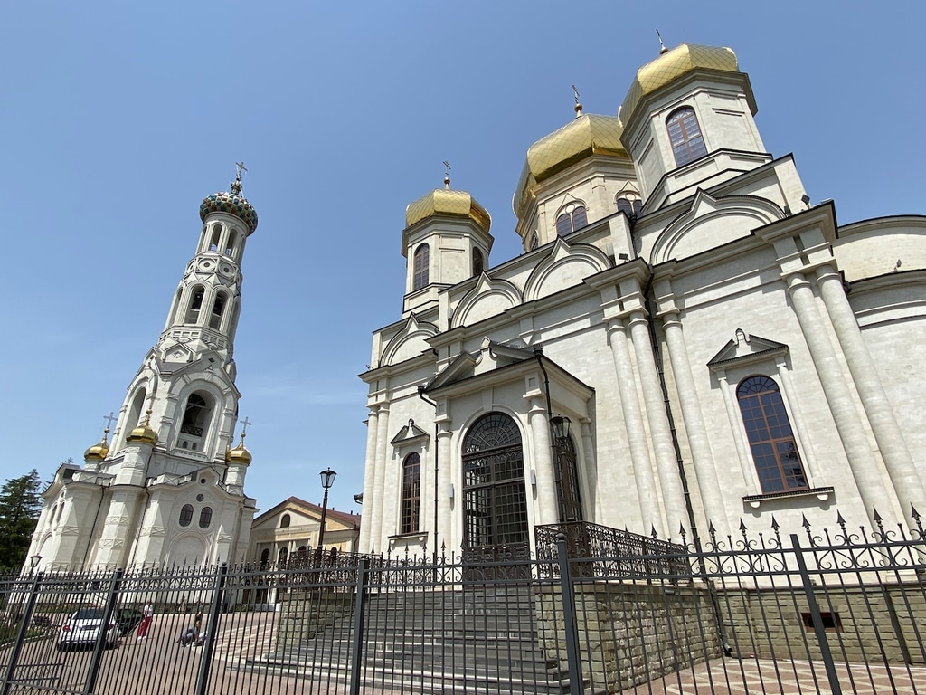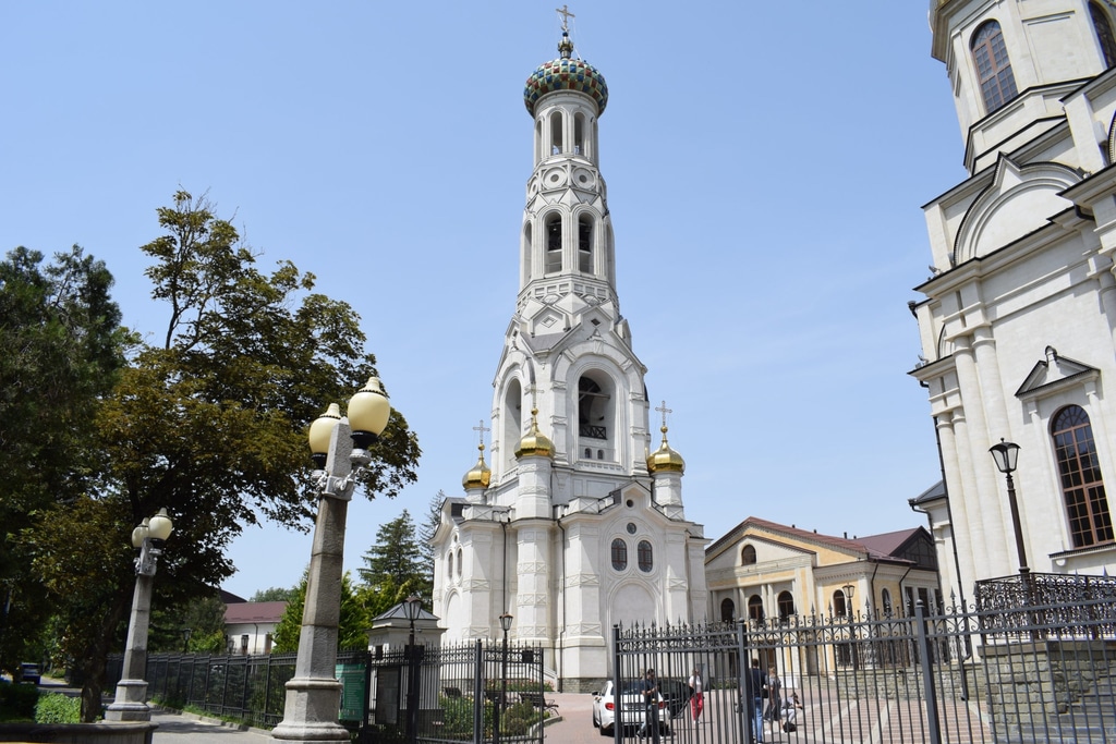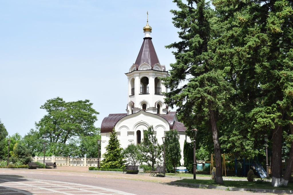 Дальше за пожарной частью возвышается величественное здание Казанского собора. Это самое высокое здание Ставропольского края. Его высота составляется 76 метров. Храм построен в 2012 году на месте старого, взорванного при советской власти.