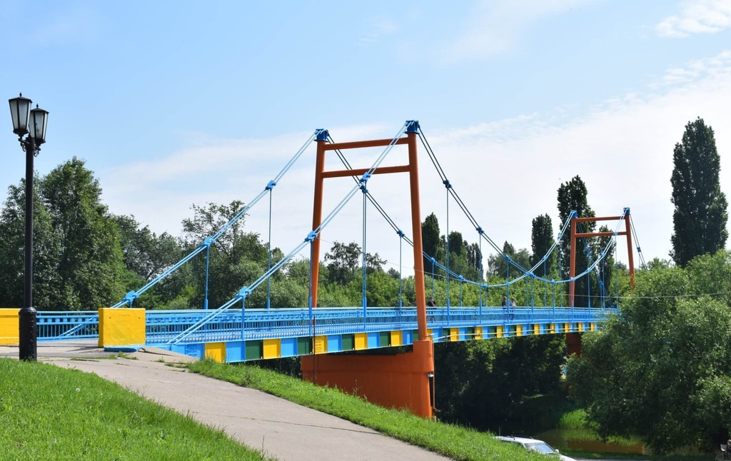 На набережной нас встречает яркий пешеходный мостик без названия и особых изысков.