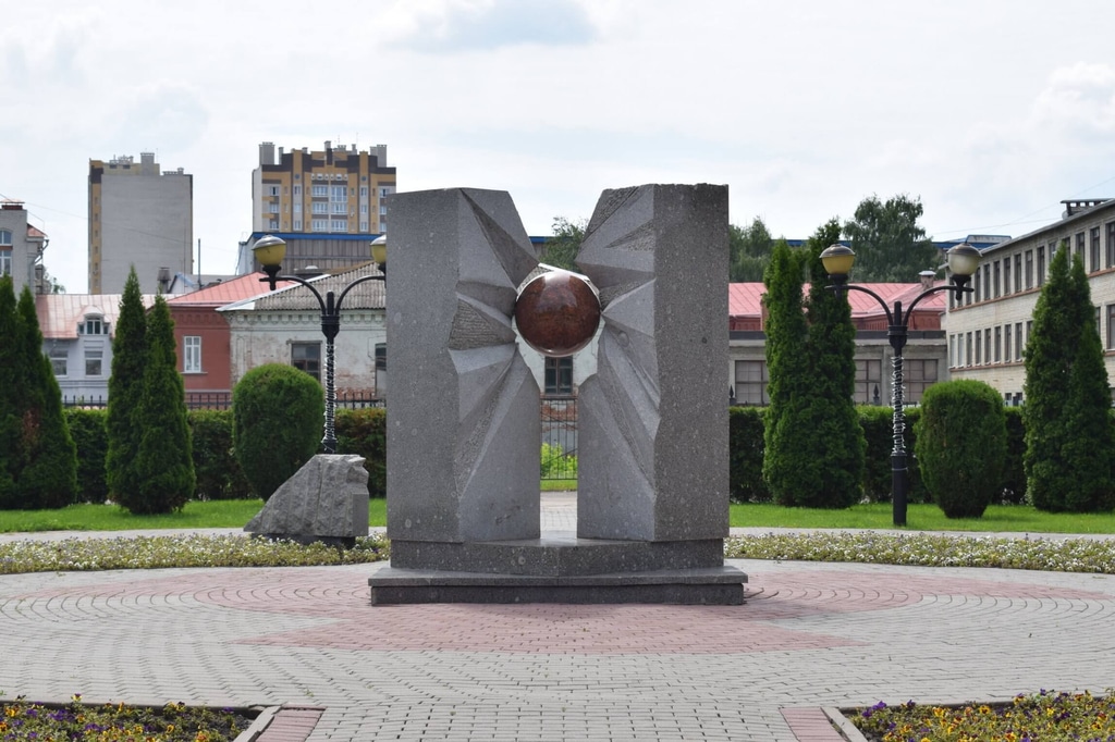 Здесь же на Кронштадской площади установлен памятник жертвам ядерных катастроф. Две гранитные плиты держат с двух сторон каменный шар, символизирующий разрывающийся атом. Памятник на площади появился в 2011 году.