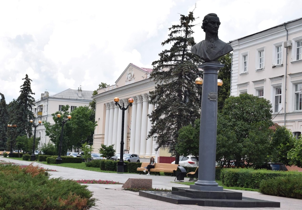 Дальше на нашем пути — здание Тамбовского государственного университета имени Державина, бюст Державина и Гостиный двор.