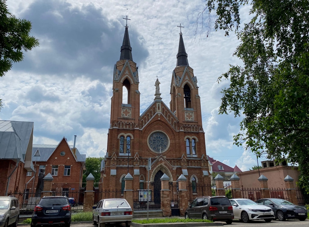 Недалеко от дома Чичериных возвышается довольно интересный храм. Это католическая церковь Воздвижения святого креста. Храм начал функционировать в 1903 году. Его прихожанами на тот момент, в основном, были поляки.