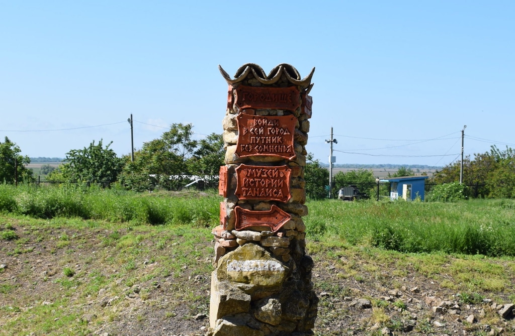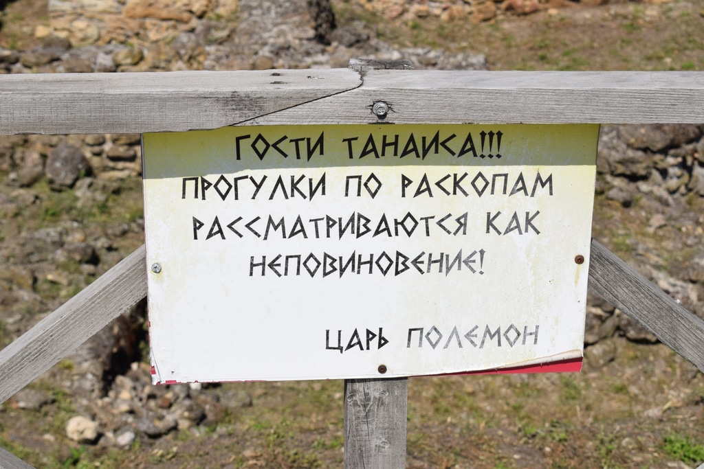 По самим раскопкам ходить запрещается. Об этом извещает шутливая табличка с подписью царя Полемона. Этот Полемон — вполне себе реальный персонаж. Он жил в 1 веке до нашей эры и был первым разрушителем Танаиса.