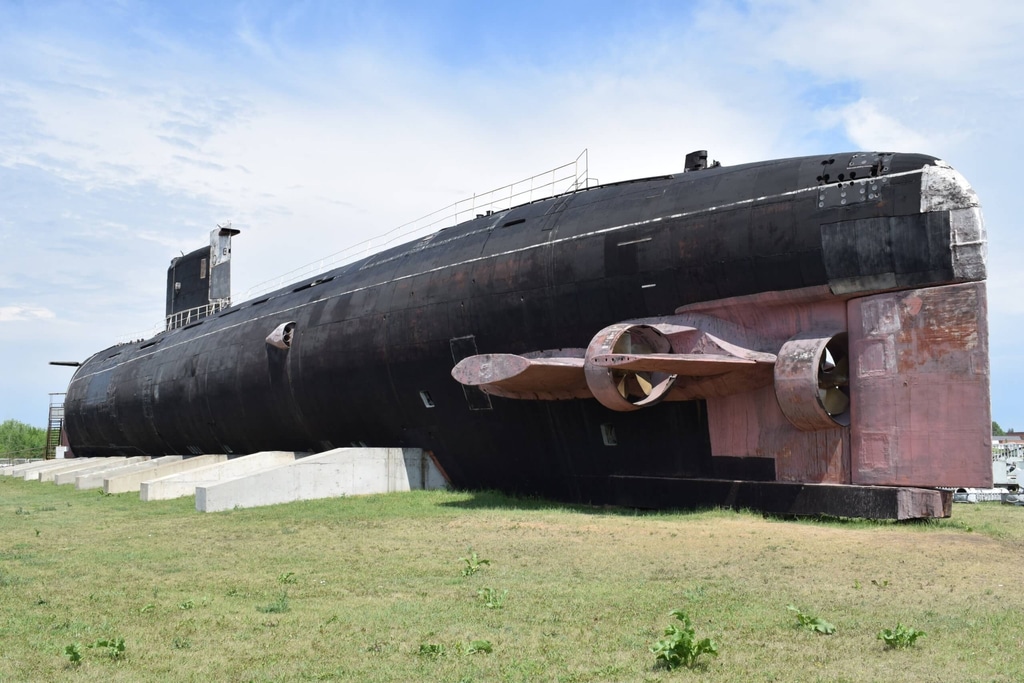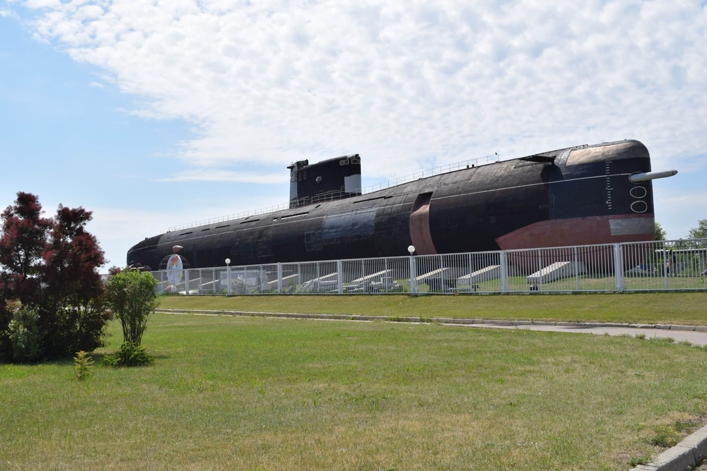 А это задняя часть субмарины. Конечно, в натуральном виде подводная лодка смотрится гораздо величественнее и масштабнее, чем на фотографии. Эдакая бронированная громадина, напичканная смертоносным оружием.