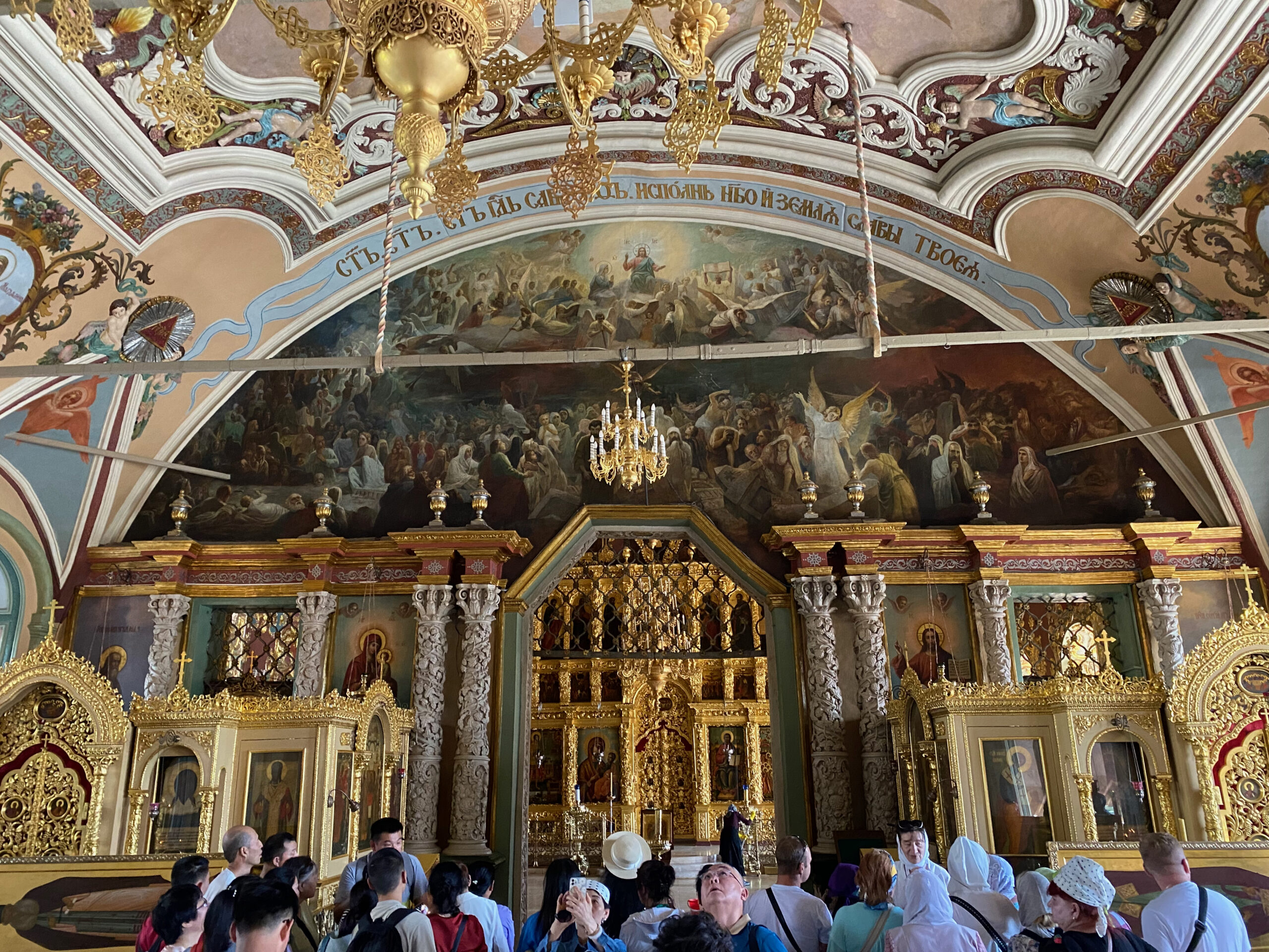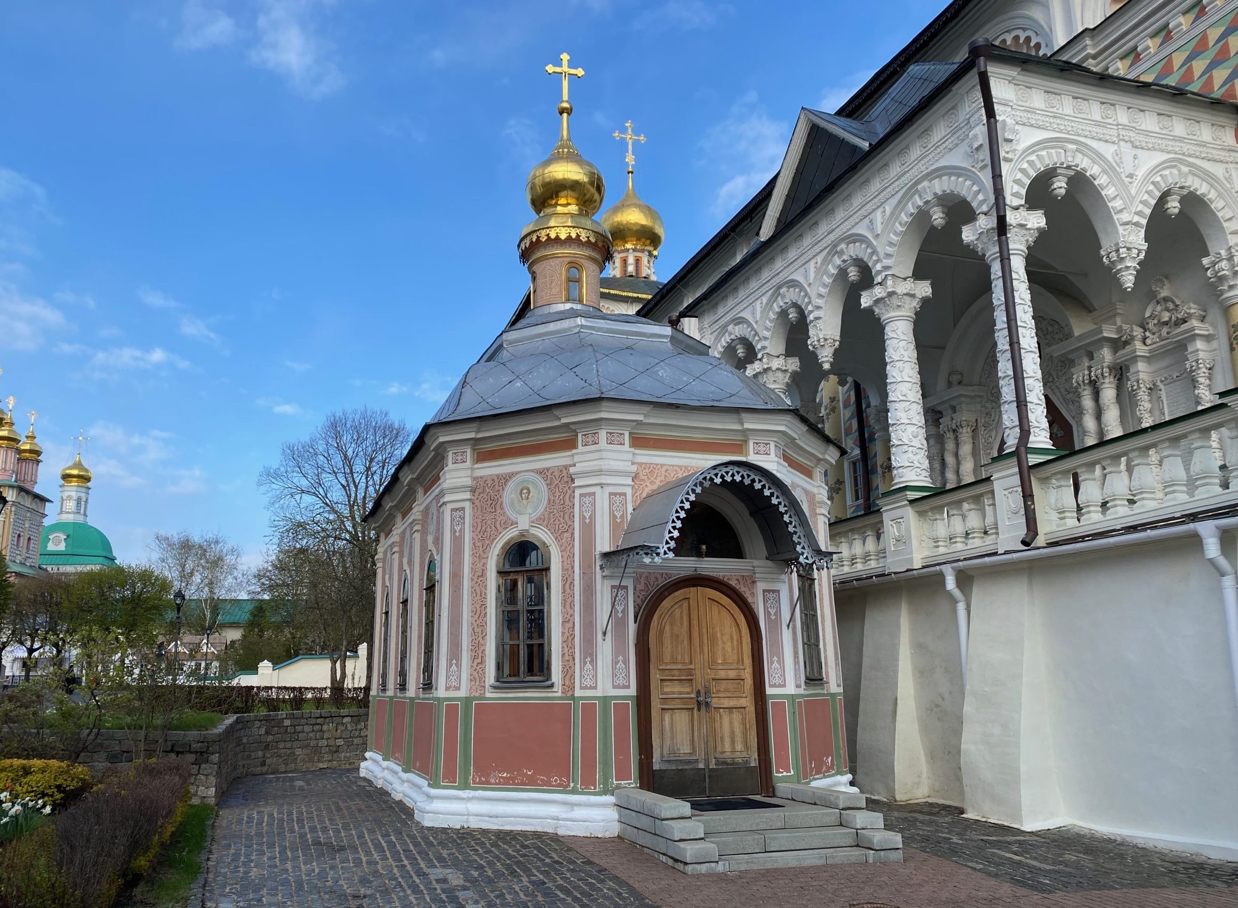 За воротами открываются живописная панорама: слева — Сергиевская церковь с Трапезной палатой, прямо — Духовская церковь, справа — величественный Успенский собор.