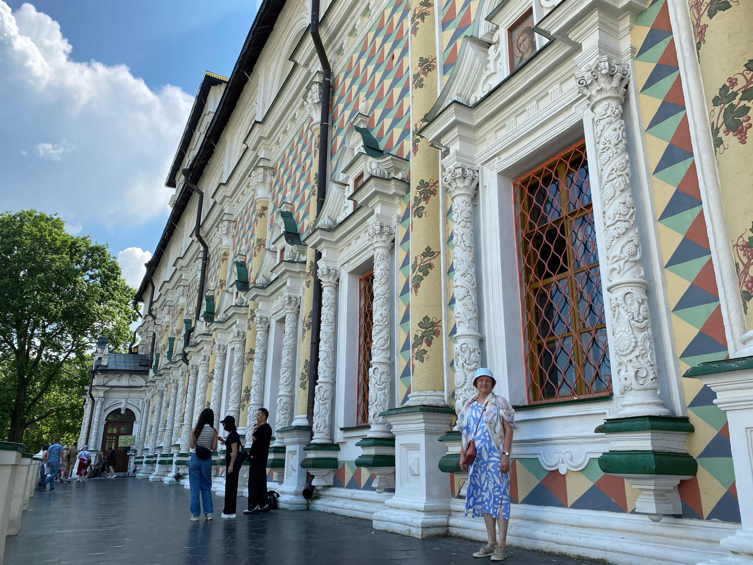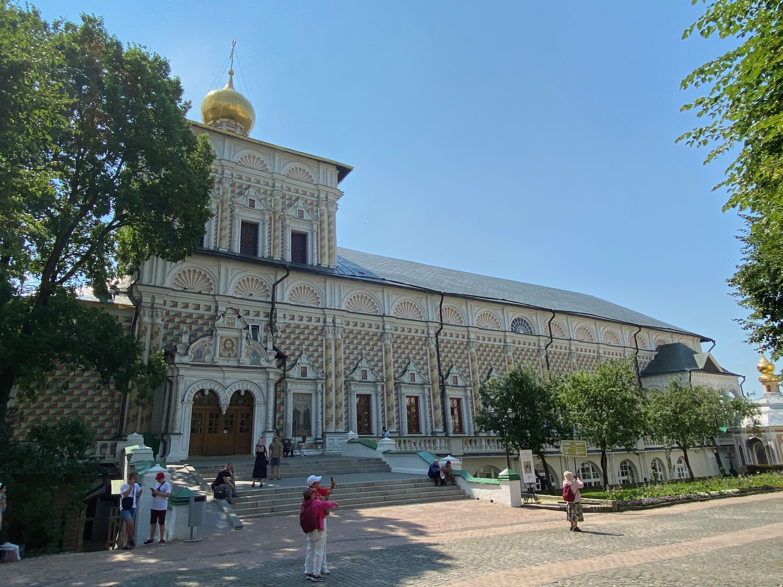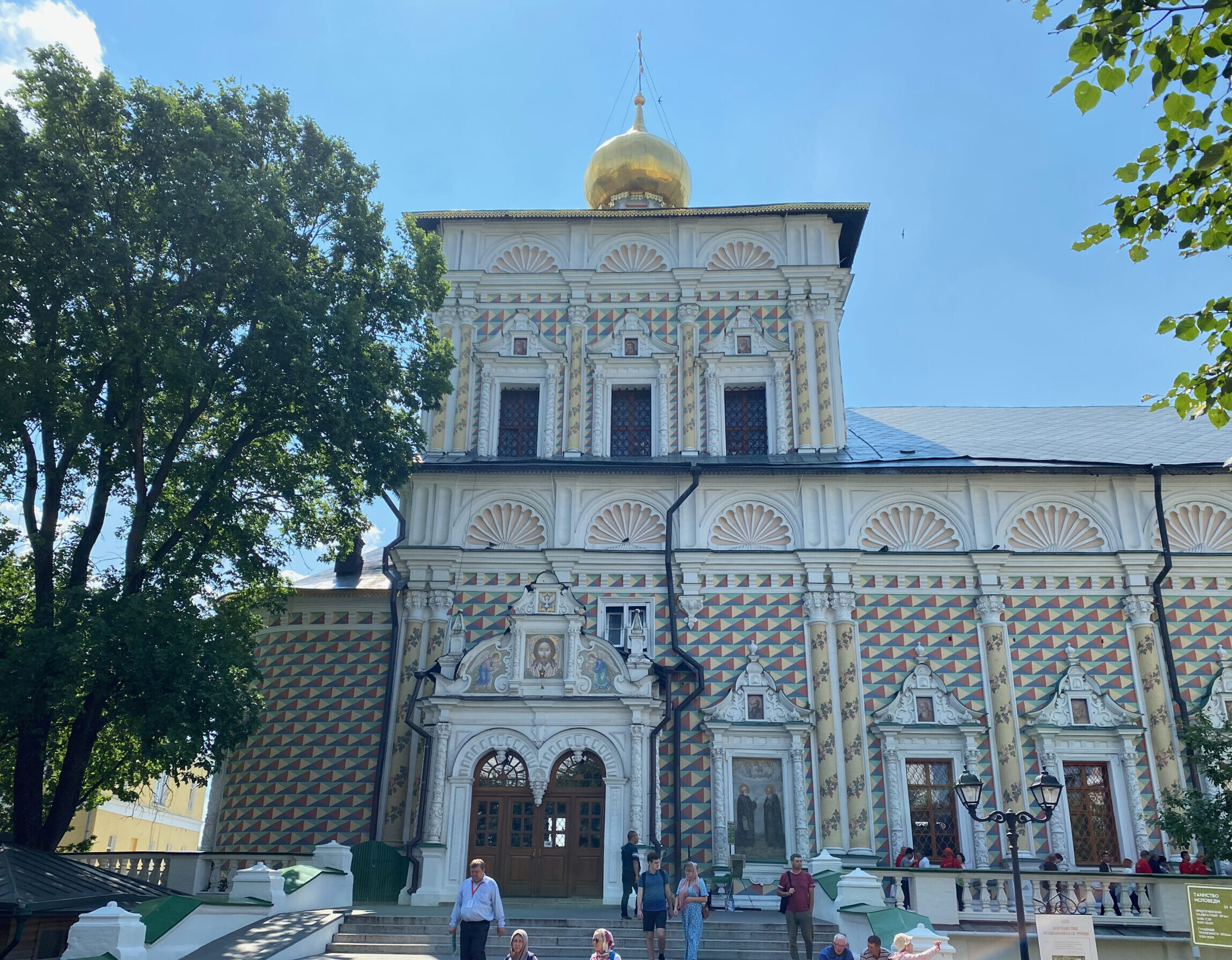 Сергиевскую церковь с трапезной палатой построили в 1692 году. Здание — настоящий праздник для глаз: нарядное, с колоннами, со стенами, расписанными «в шахмат» разноцветными красками.