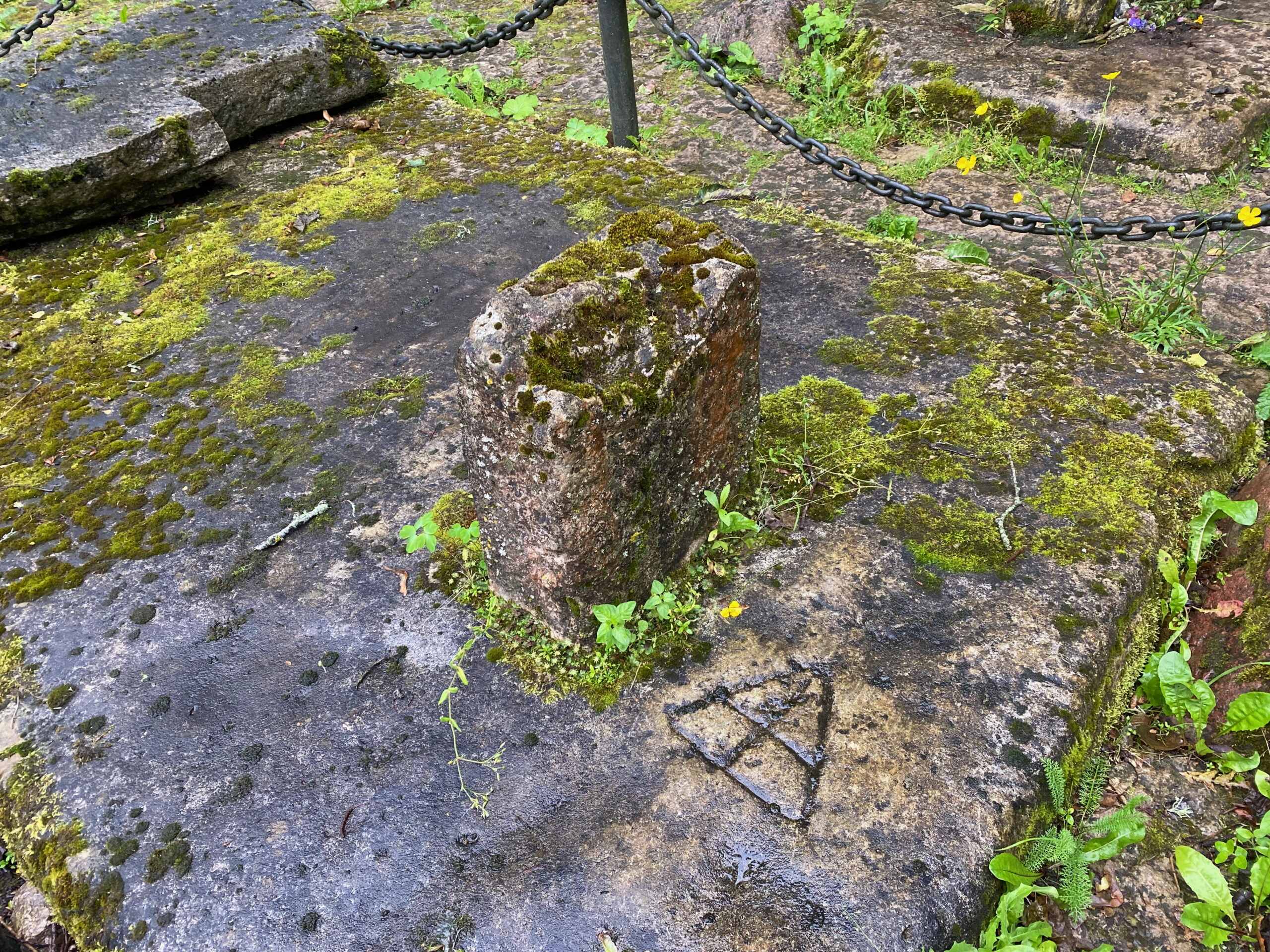 Труворов крест окружают древние плиты, на которых, видимо, тоже когда-то стояли похожие кресты. На плитах рядом с крестами выбиты загадочные геометрические изображения.