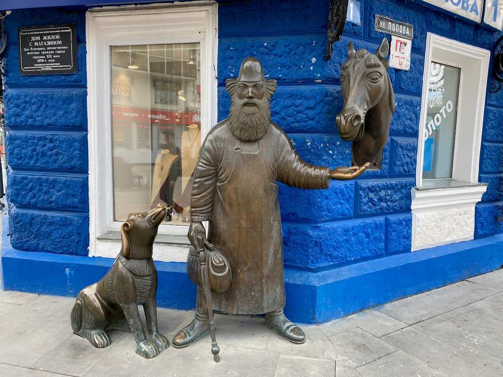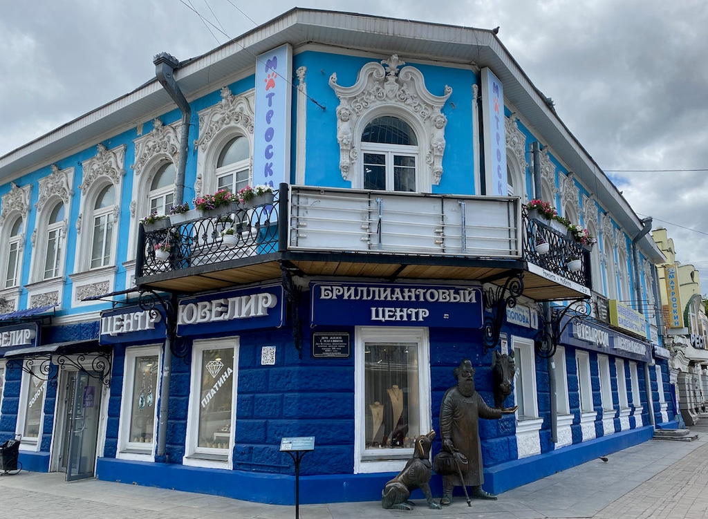 Угол дома Телегиных украшает скульптурная композиция «Друзья» с тремя персонажами: кузнецом, лошадью и собакой. Прообразом кузнеца стал вполне реальный человек Александр Лысяков. Он живет в Екатеринбурге и держит кузницу на озере Шарташ. Собака и лошадь у настоящего кузнеца тоже имеются в наличии. При желании можно поехать на озеро и лично удостовериться в их существовании.