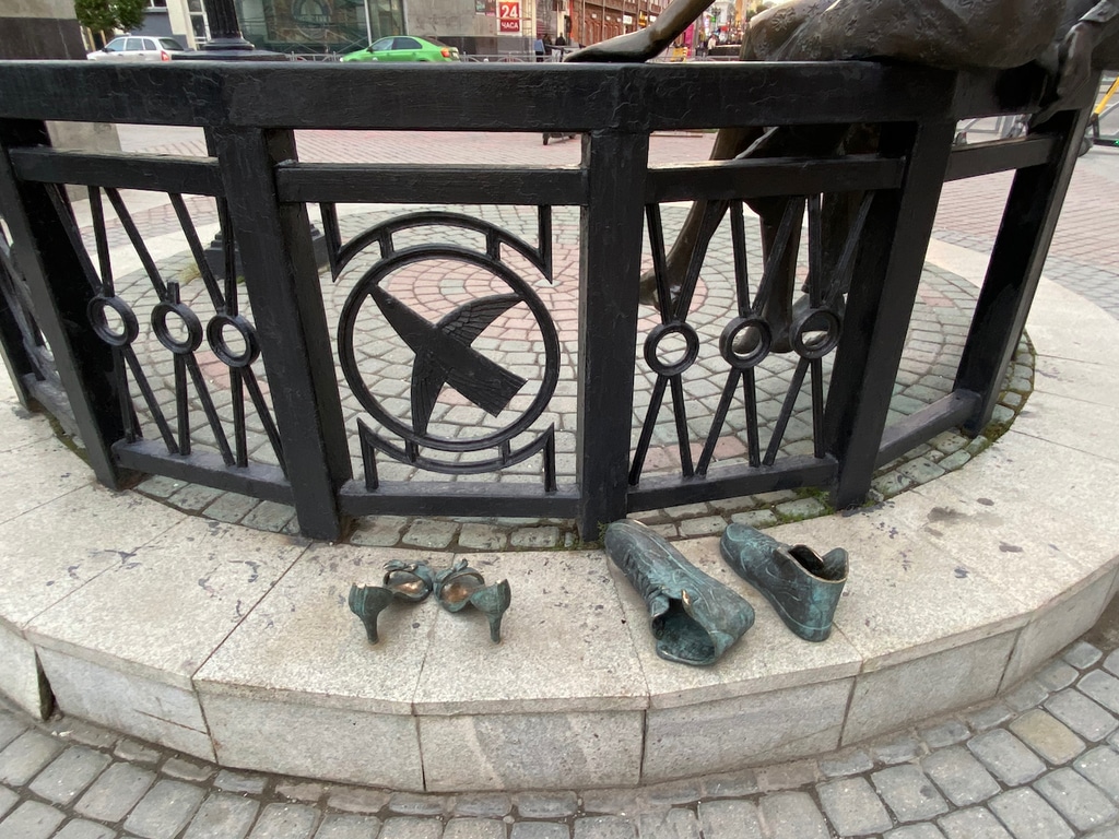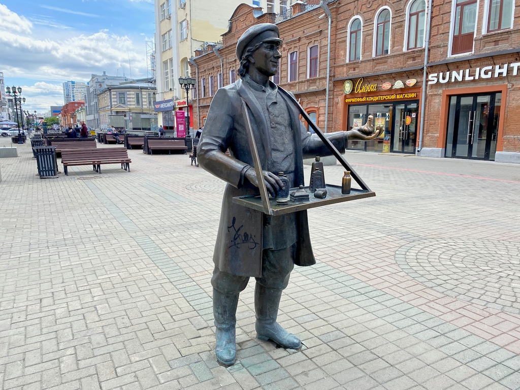 Памятник главному герою телесериала «Счастливы вместе» появился на улице Вайнера в 2011 году. По сюжету фильма продавец обуви Гена Букин жил и работал в Екатеринбурге. Здесь он так и изображен с башмаком в одной руке. Ага! Носик туфельки затерт до золотого блеска! Трем, не стесняемся!