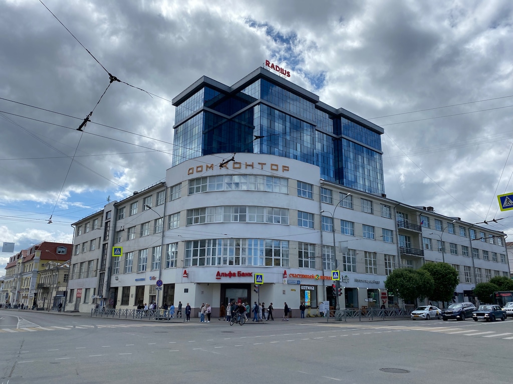 Дом контор построили в 1929 году. Это было одно из первых зданий Екатеринбурга в новом конструктивистском стиле. Облик этого дома символизировал происходящие в стране глобальные перемены. Старый буржуазный уклад жизни рухнул, ему на смену пришел новый советский.
