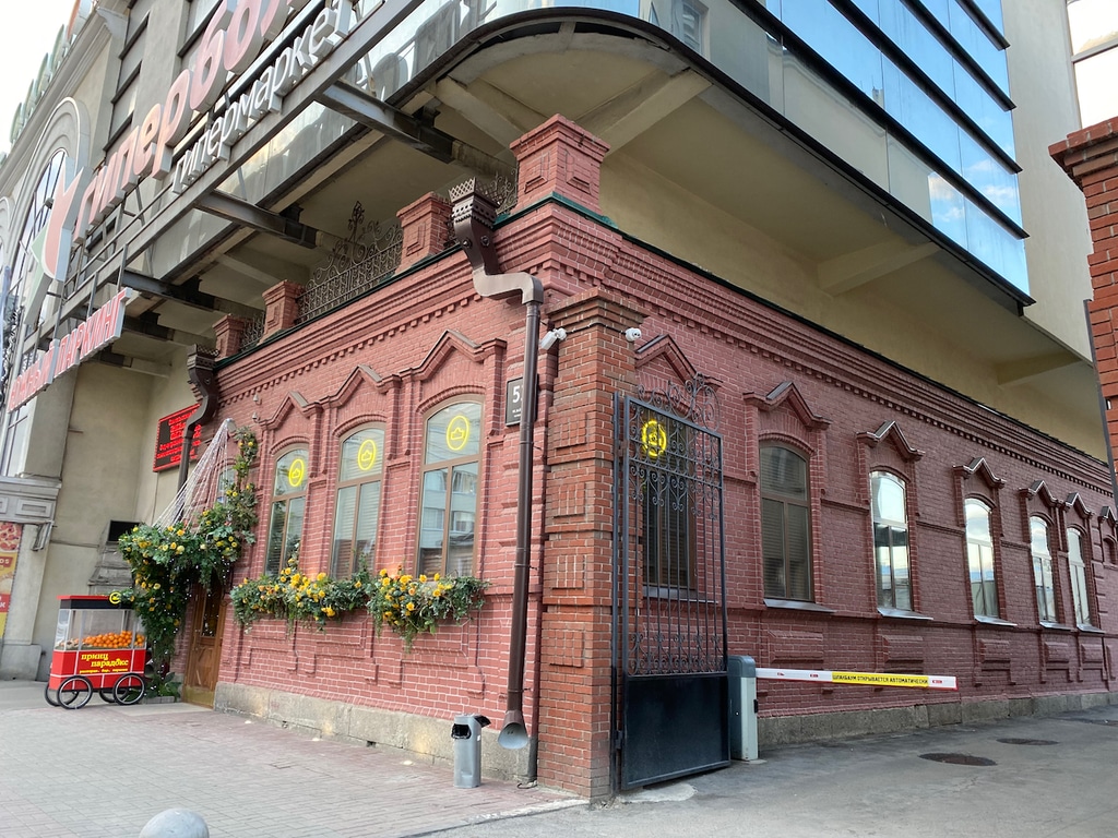 Последний старинный особняк будто присел под нависающей над ним громадиной. Особняк построен в конце 19 века и до революции принадлежал мещанину Лазареву. В 2004 году рядом с ним открылся огромный торговый центр «Гринвич» и старый дом по соседству оказался втиснутым в его конструкцию.