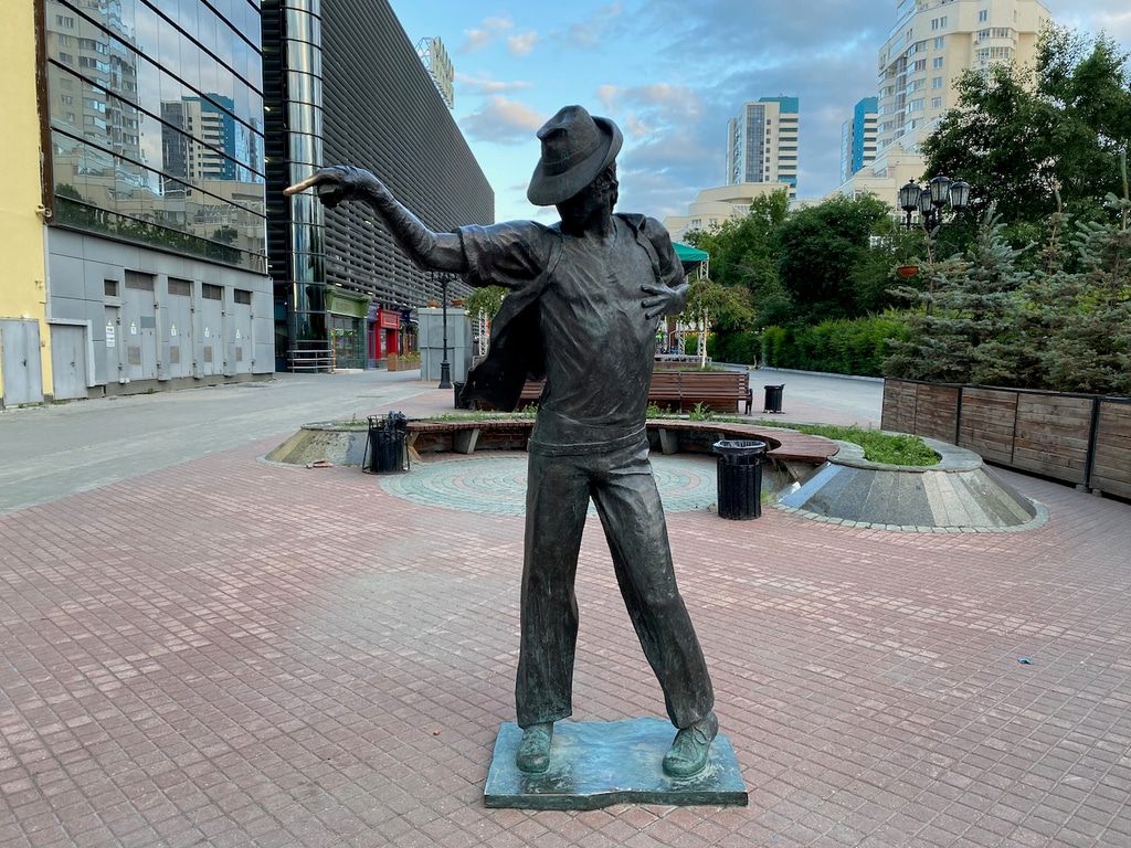 Скульптура королю поп-музыки на улице Вайнера установили по просьбе его фанатов, которых в Екатеринбурге довольно много. Бронзовый американец застыл в своей коронной позе перед тем, как исполнить так полюбившуюся всеми «лунную походку».