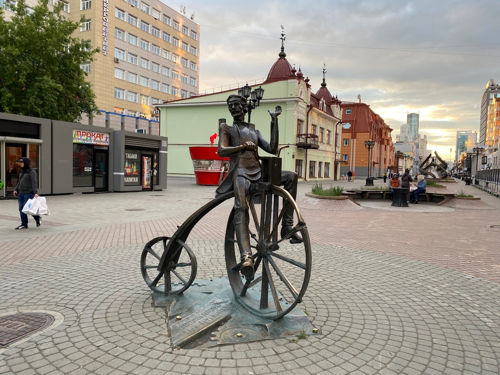 Памятник изобретателю велосипеда появился в Екатеринбурге, как и многие другие, в 2006 году. По местной легенде велосипед создал уральский рабочий Артамонов еще в 1801 году. Он даже ездил в столицу и показывал свое изобретение Александру I, за что монарх освободил его от крепостной зависимости.