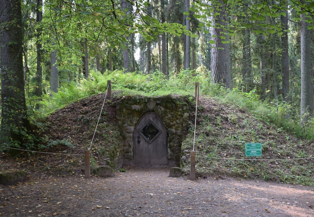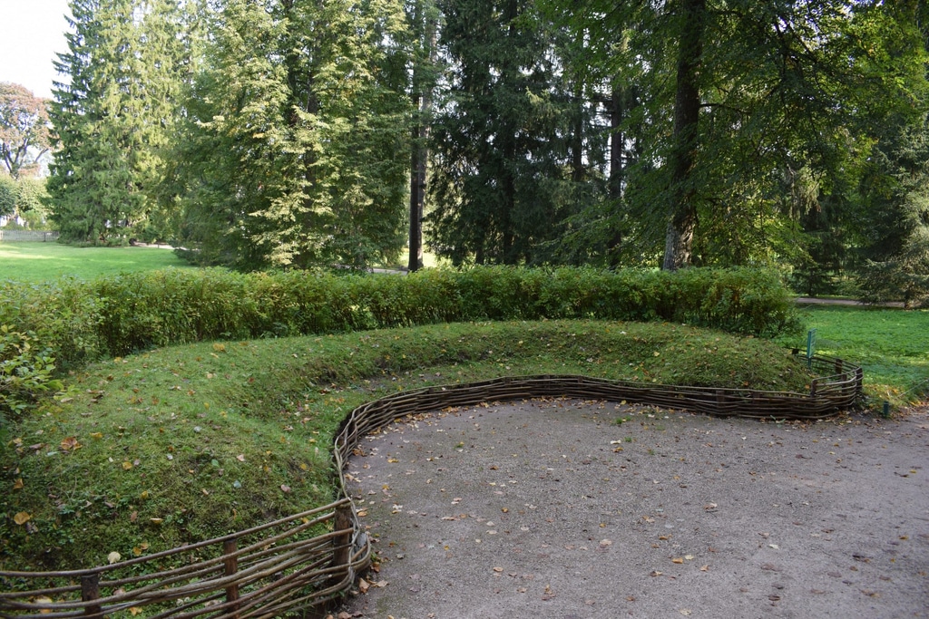 Среди елей скрываются терновый диван и грот, тоже созданные еще в бытность деда Пушкина.