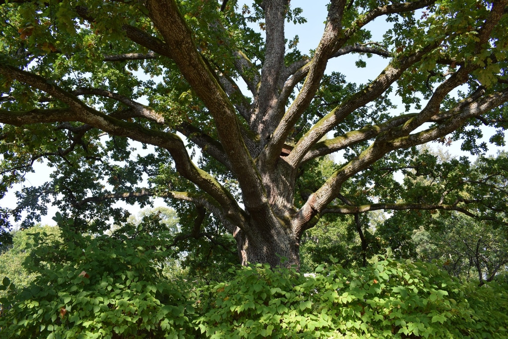 У дуба удивительная судьба. Во время немецкой оккупации под корнями дуба был вырыт блиндаж и сотрудникам музея после освобождения усадьбы пришлось очень долго «лечить» это дерево. Как видно на фотографии, «лечение» прошло довольно успешно и дуб не погиб.