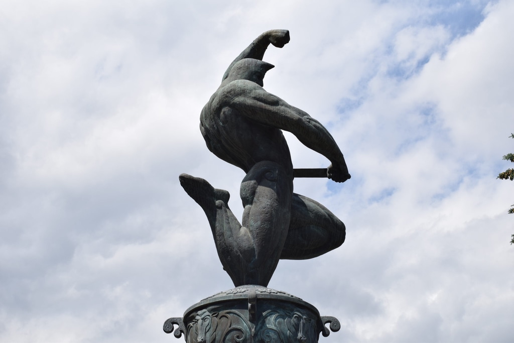 Сослан — богатырь из мифологии народов Кавказа. В танце герой опирается коленом на закрытую чудодейственную Чашу Уацамонга. По краям бассейна сидят мифологические существа из подземного мира.