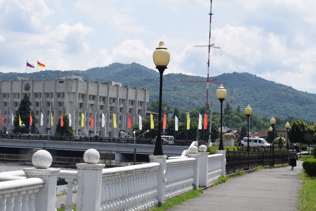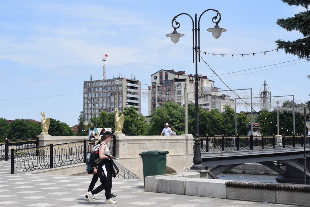За Чугунным мостом виднеется типично советское здание городской администрации, а еще дальше — Кавказские горы. Где-то там среди них находится могучий великан Казбек.