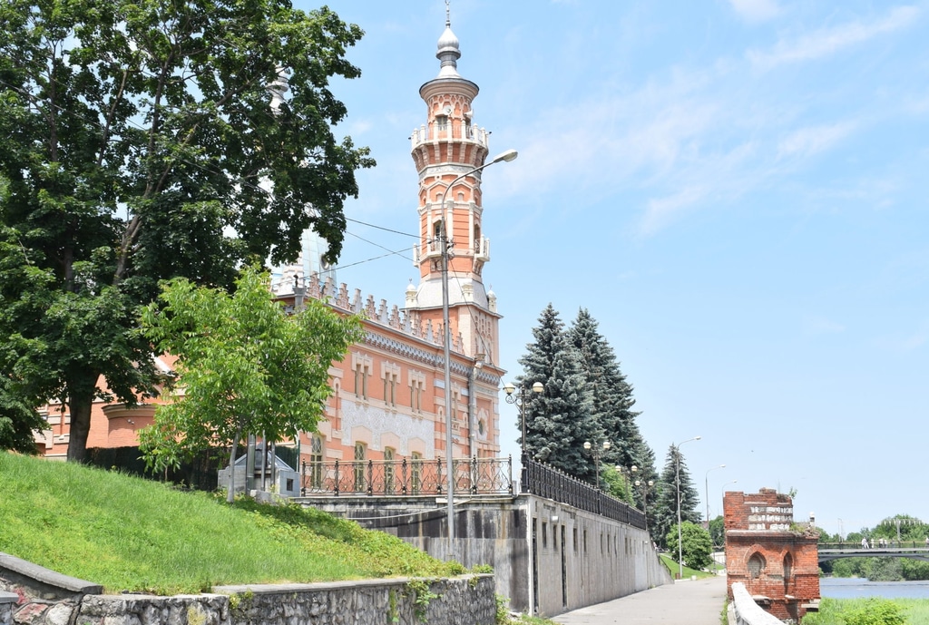 Рядом на берегу виднеется странное сооружение из красного кирпича. Это подпорная стена, защищающая мечеть от бурного Терека.