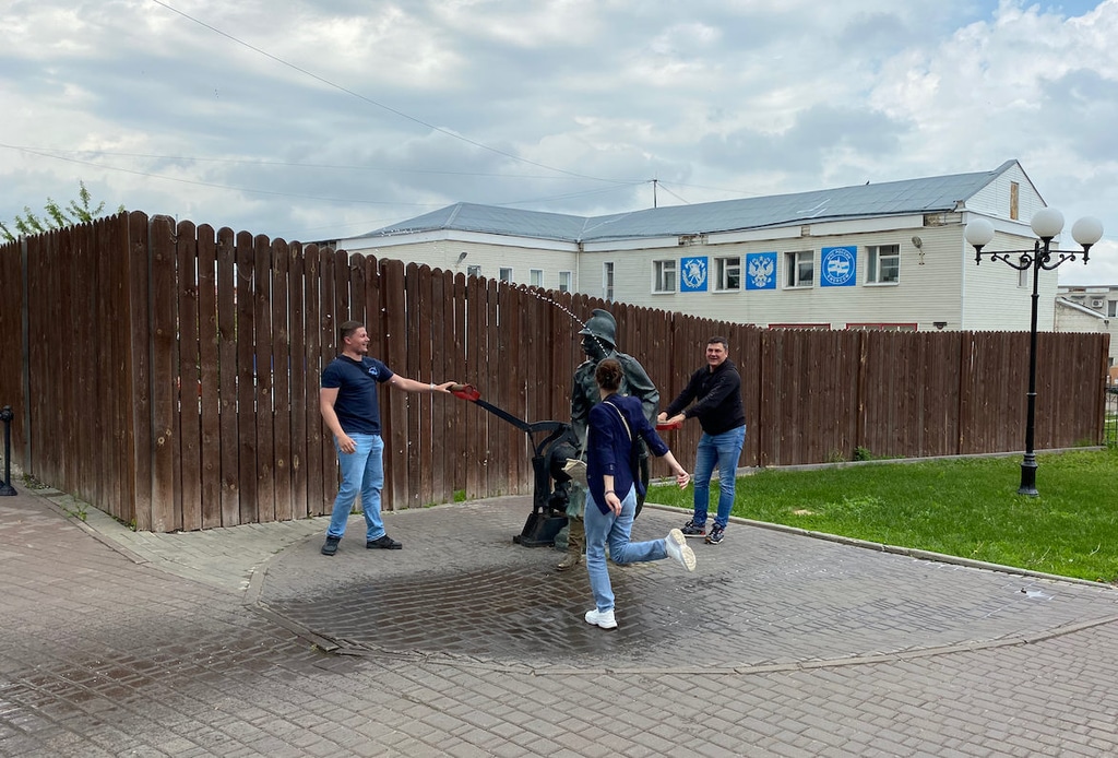 Памятник пожарному установлен рядом с пожарной частью. Бронзовая фигура не статична. Если нажать на рычаг, то пожарник «с удовольствием» окатит вас настоящей водой.