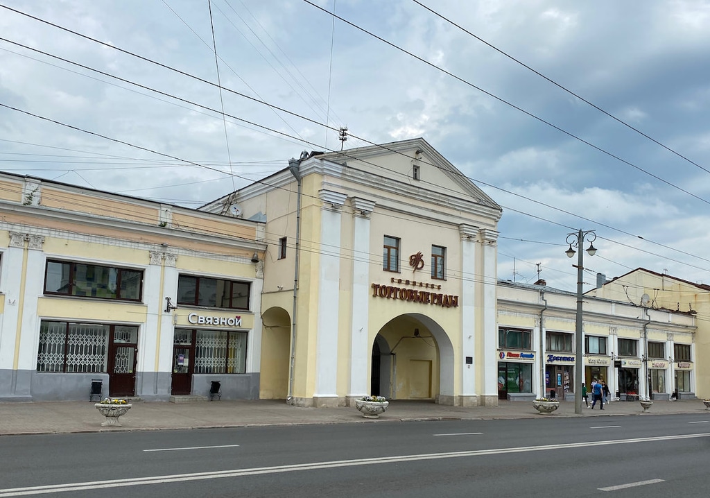 Недалеко от храма на другой стороне Большой Московской находится еще одна достопримечательность Владимира — Торговые ряды. Когда-то на этом месте стояли деревянные купеческие лавки. В конце 18 века лавки снесли, а на их месте построили каменные торговые ряды. На тот момент они были лицом Большой Московской. До наших дней ряды дошли в измененном виде. За 200 с лишним лет их неоднократно перестраивали.