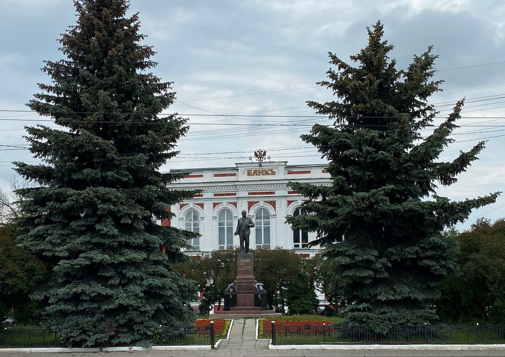 Рядом со Сбербанком за небольшим сквером с памятником Ленину скрывается здание дореволюционного банка. Его плохо видно за большими елями. Здание банка построено в 1896 году. На месте Ленина до революции стоял памятник Александру II.