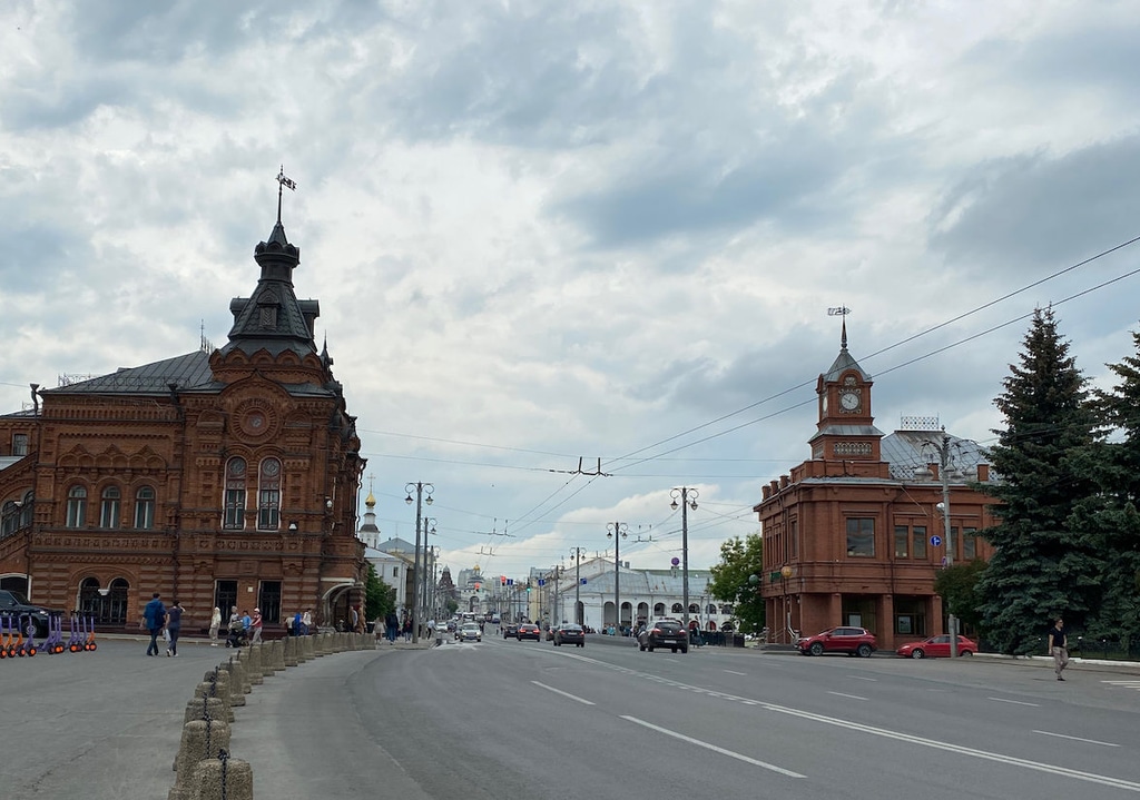Выход улицы Большой Московской на Соборную площадь с двух сторон украшают два красивых здания из красного кирпича.