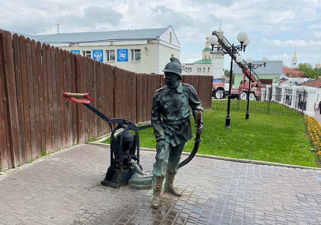 Памятник пожарному установлен рядом с пожарной частью. Бронзовая фигура не статична. Если нажать на рычаг, то пожарник «с удовольствием» окатит вас настоящей водой.