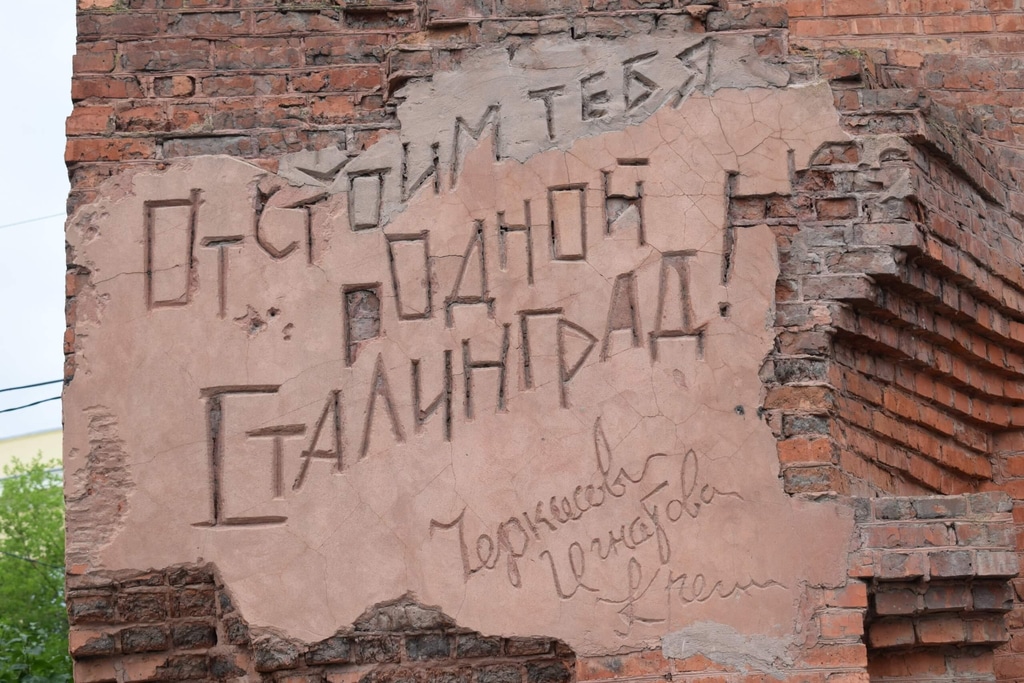 После войны дом восстановили одним из первых, а его торец украсили фрагментом полуразрушенной стены. На кирпичной стене надпись «Отстоим тебя, родной Сталинград».