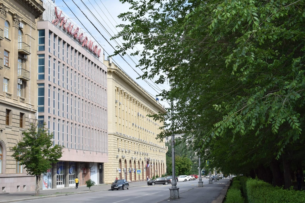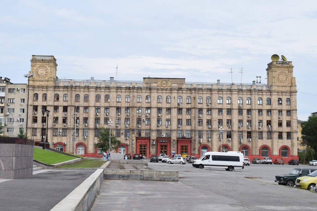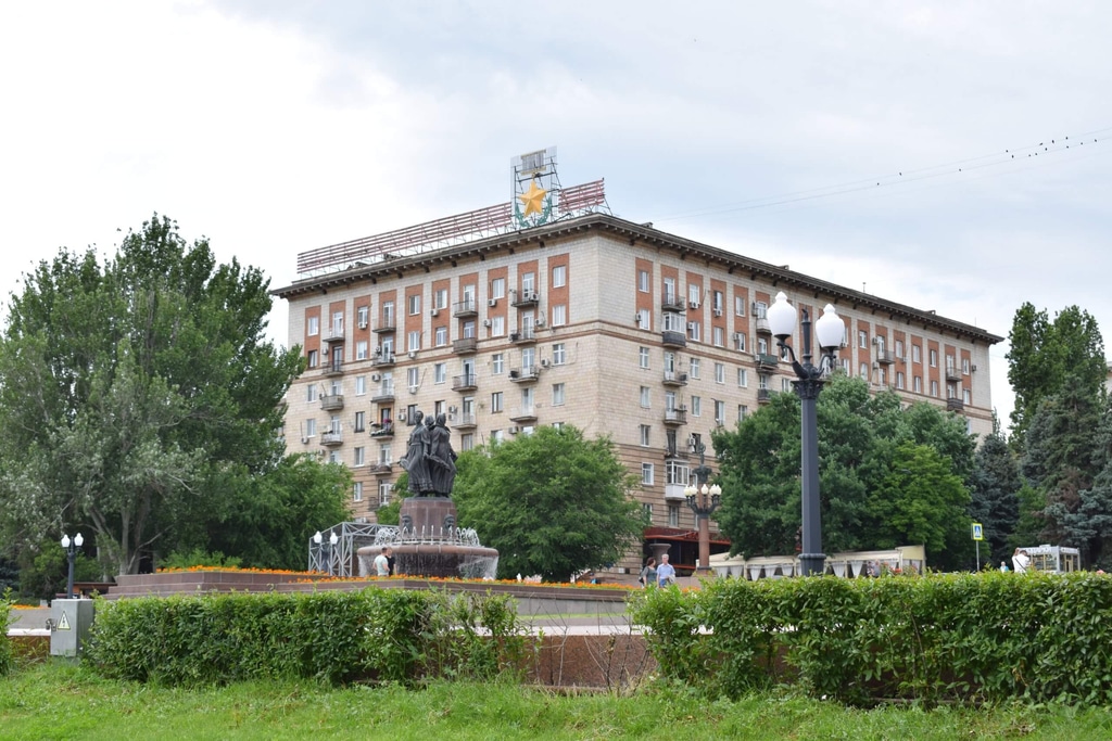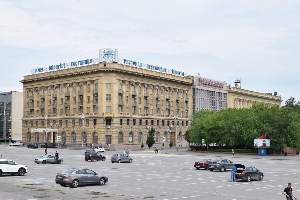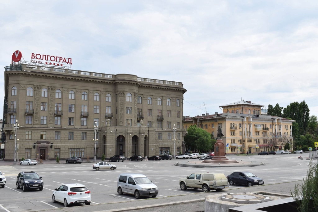 Площадь Павших Борцов окаймляют три монументальных дома: отель Волгоград, ресторан Интурист и Почтамт.