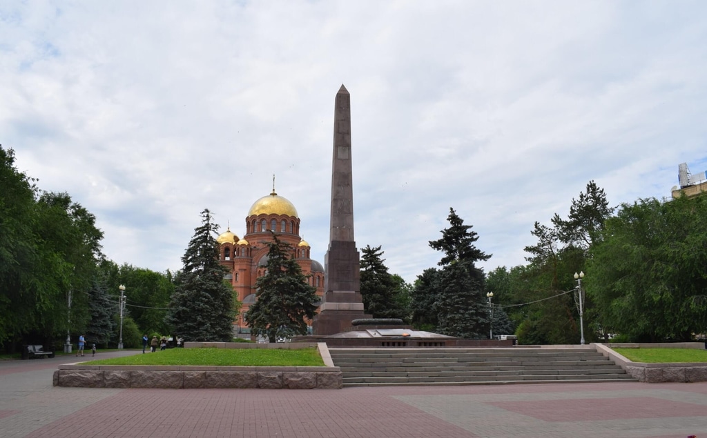 Часть площади Павших Борцов занимает сквер, который тянется от собора Александра Невского к Аллее Героев. В сквере в братских могилах во время Гражданской войны и после Сталинградской битвы хоронили погибших красноармейцев. В честь павших воинов здесь установлены гранитный обелиск, Вечный огонь и памятник с изображением коленопреклоненного воина.