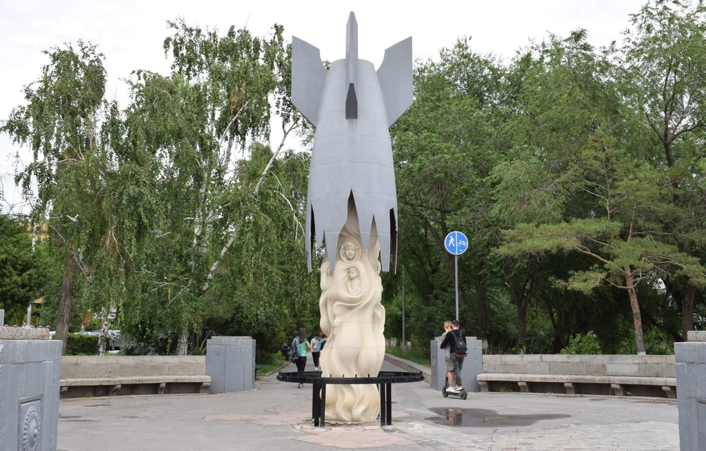 Памятник выполнен в виде разорвавшейся бомбы, под которой изображены мирные жители Сталинграда.