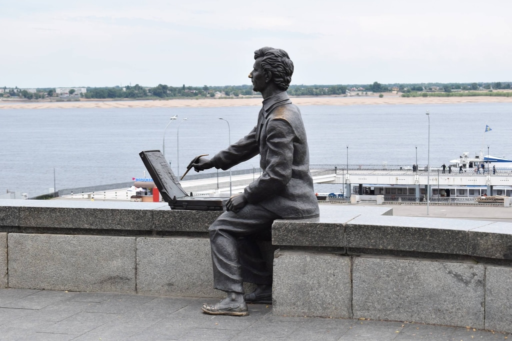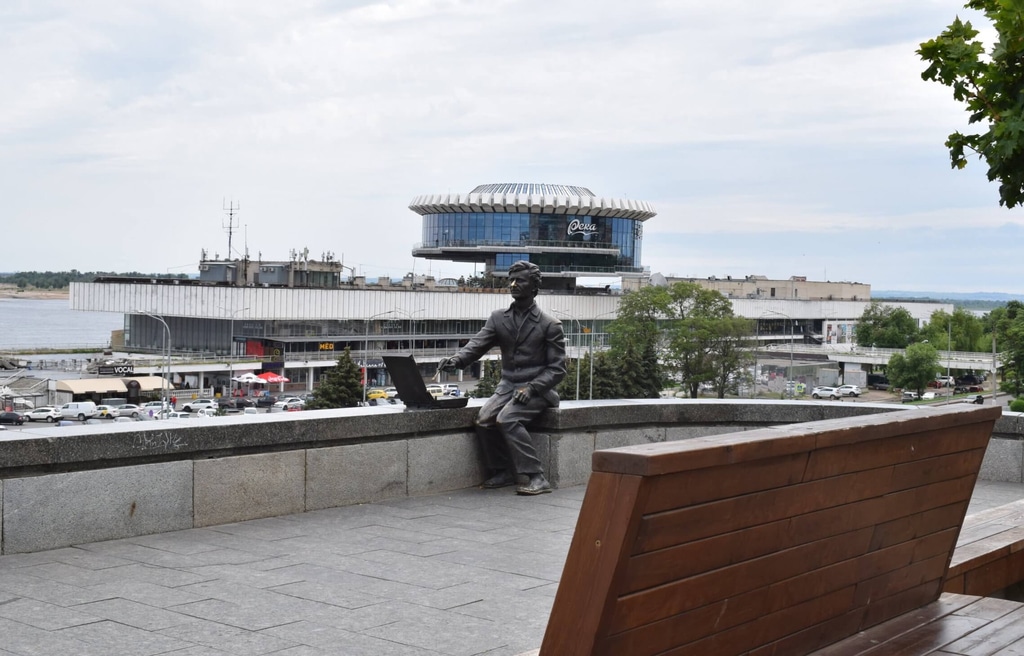 Набережную украшает симпатичная скульптура художника. Кстати сказать, скульптура не абстрактная, а вполне себе конкретная. Это местный художник Виктор Лосев. Этот художник прославился тем, что он любил всем дарить свои работы. Ему казалось, что так его живописное наследие сохранится дольше и наверняка. Наверное, так и есть. Не зря же о Лосеве горожане не забыли и отлили его в бронзовой скульптуре.