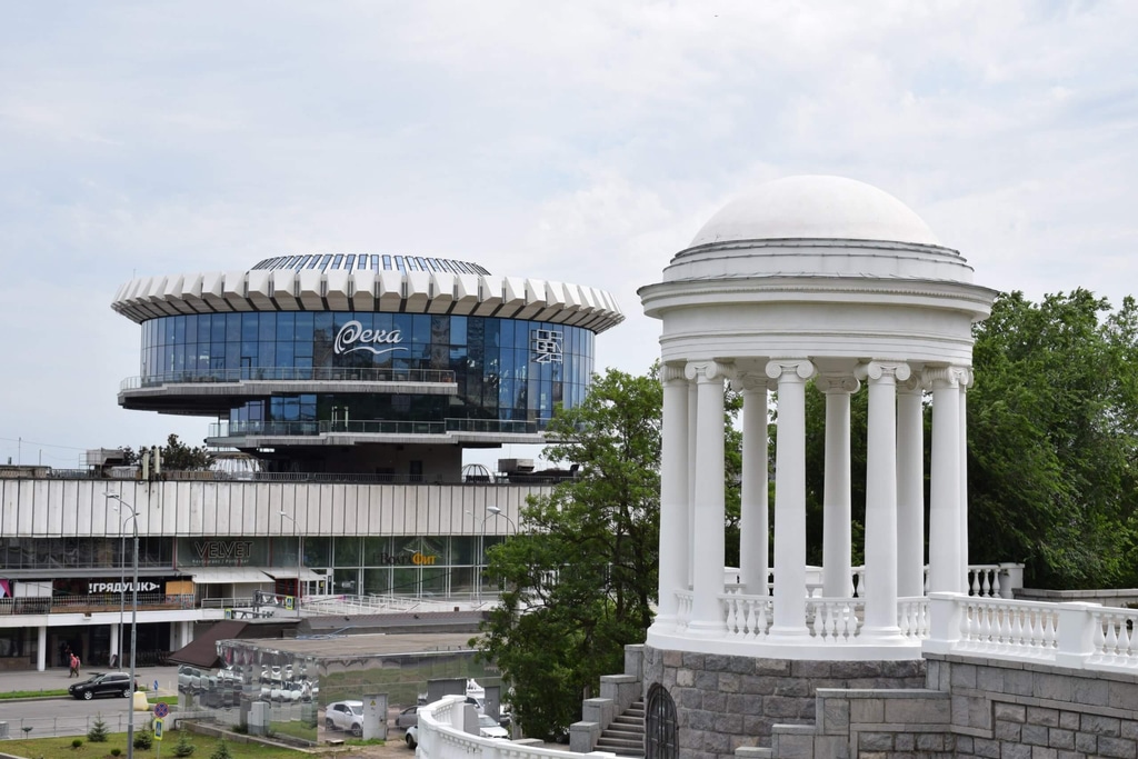 За ротондой просматривается здание речного вокзала. Это одно из крупнейших сооружений такого типа в Европе. Строился современный вокзал довольно долго с 1967 по 1989 год. До 1967 года здесь стоял небольшой деревянный вокзал, возведенный в 1952 году. До 1950-х годов речного вокзала здесь фактически не было. Хотя городской порт работал еще задолго до революции.