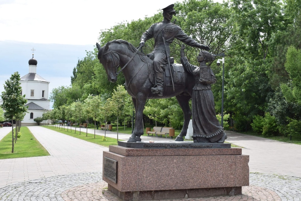 А дальше по маршруту другой памятник, посвященный российскому казачеству. Называется он «Казачья слава». Памятник появился в Волгограде неслучайно. На этих землях много веков назад стали селиться донские казаки. Они защищали от врагов южные рубежи российской империи. Памятник установлен не так давно в 2010 году.